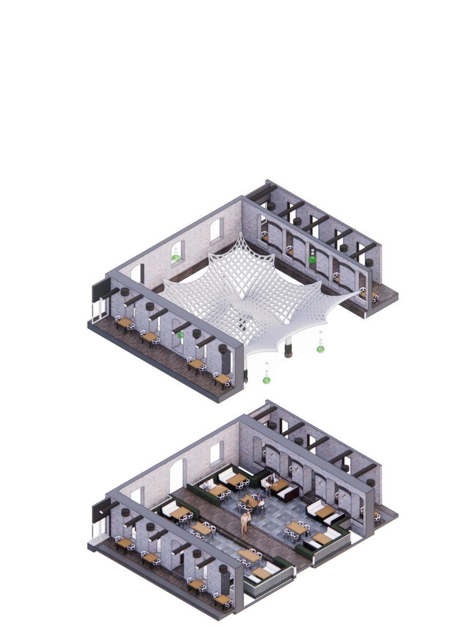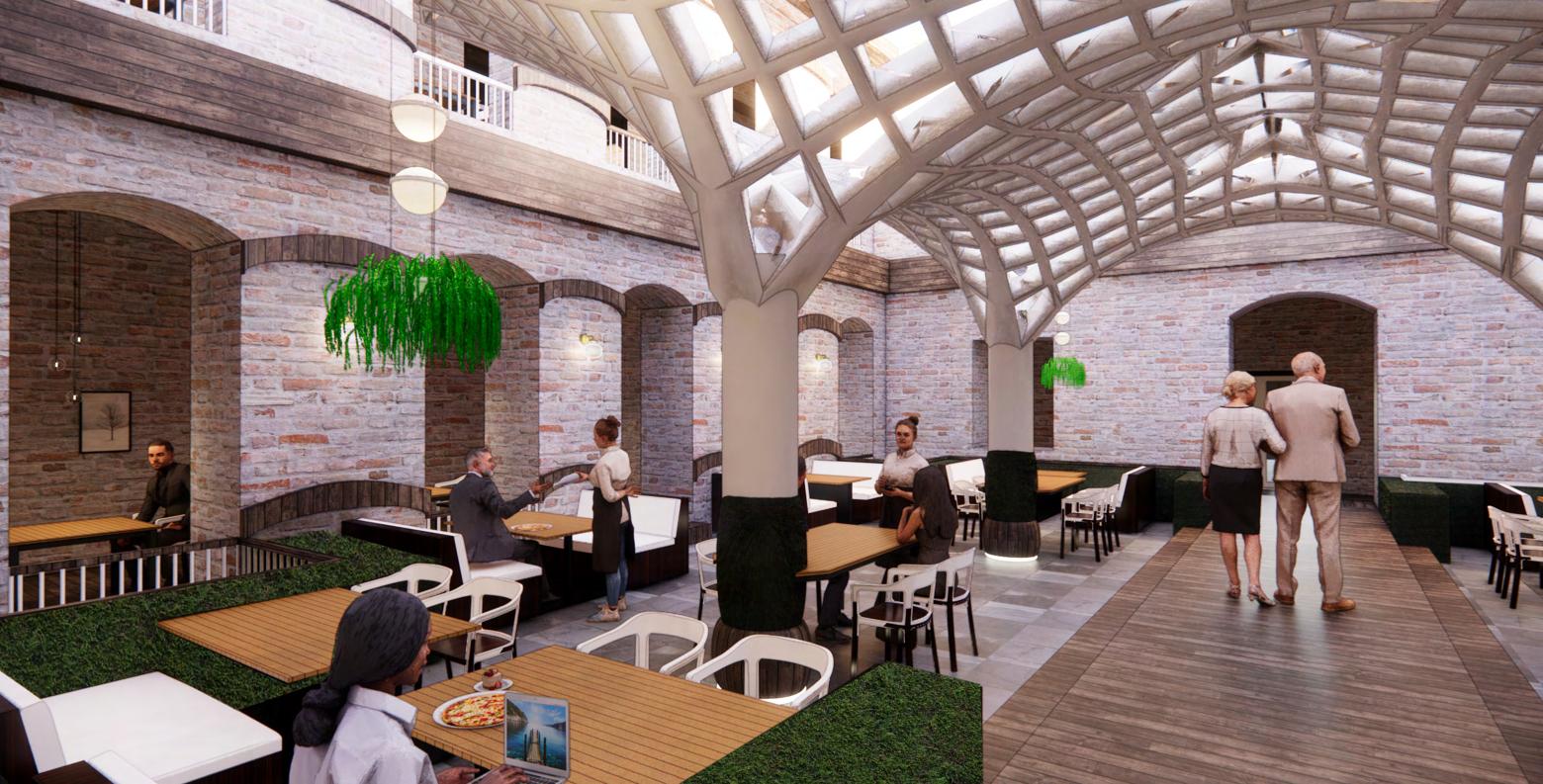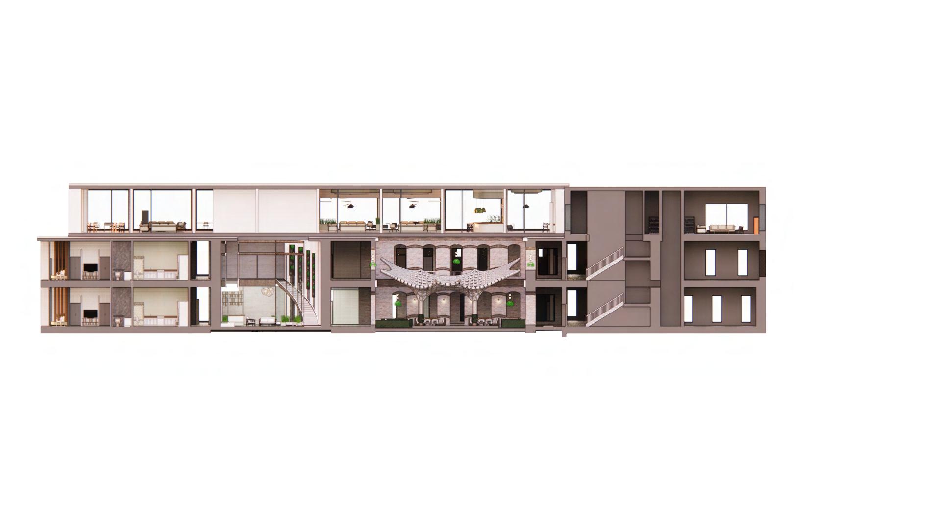 When approaching this unique building the first thing that can be captured is the history that is within the structure. The aged brick façade shows the timeless reuse of this building but is never altered. With this design the brick is not only left to its historical status but becomes the main vocal point of the product. The brick is used in this project to highlight the main exterior communal areas like the Restaurant located in the former courtyard and the Entrance Hall. Some spaces allow for the reuse of the buildings brick whereas others use a variety of similar colors and materials to remain coherent with the existing building. When walking through the main entrance the guest is greeted with a mixture of dark and light tones to contrast the sun as it sets and rises. The flooring in the entrance hall is both stone and wood to mark a contrast between materials as a form of circulation for the residents. The Residential areas and bar/café focus on using more whites and earth tones to build off Paderborn’s variety of natural amenities. The parks that surround the building can be seen from the bar/café to allow the residents to take in the morning light while enjoying a book from the library located near the café. The Restaurant is used in this design as funnel for light for the residents to be able to enjoy a nice warm breakfast in the warmth of the sun during the day, or at night be able to take in the dimly lit arches as they sit under the night sky. Both the old and new materials are used to give the guests an experience of being outdoors, allowing plants and daylighting to further that experience. Located in every. Residential space is a sunroom that is connected to the bedroom, allowing the guest a space to embrace the light while not being enveloped by it every morning.