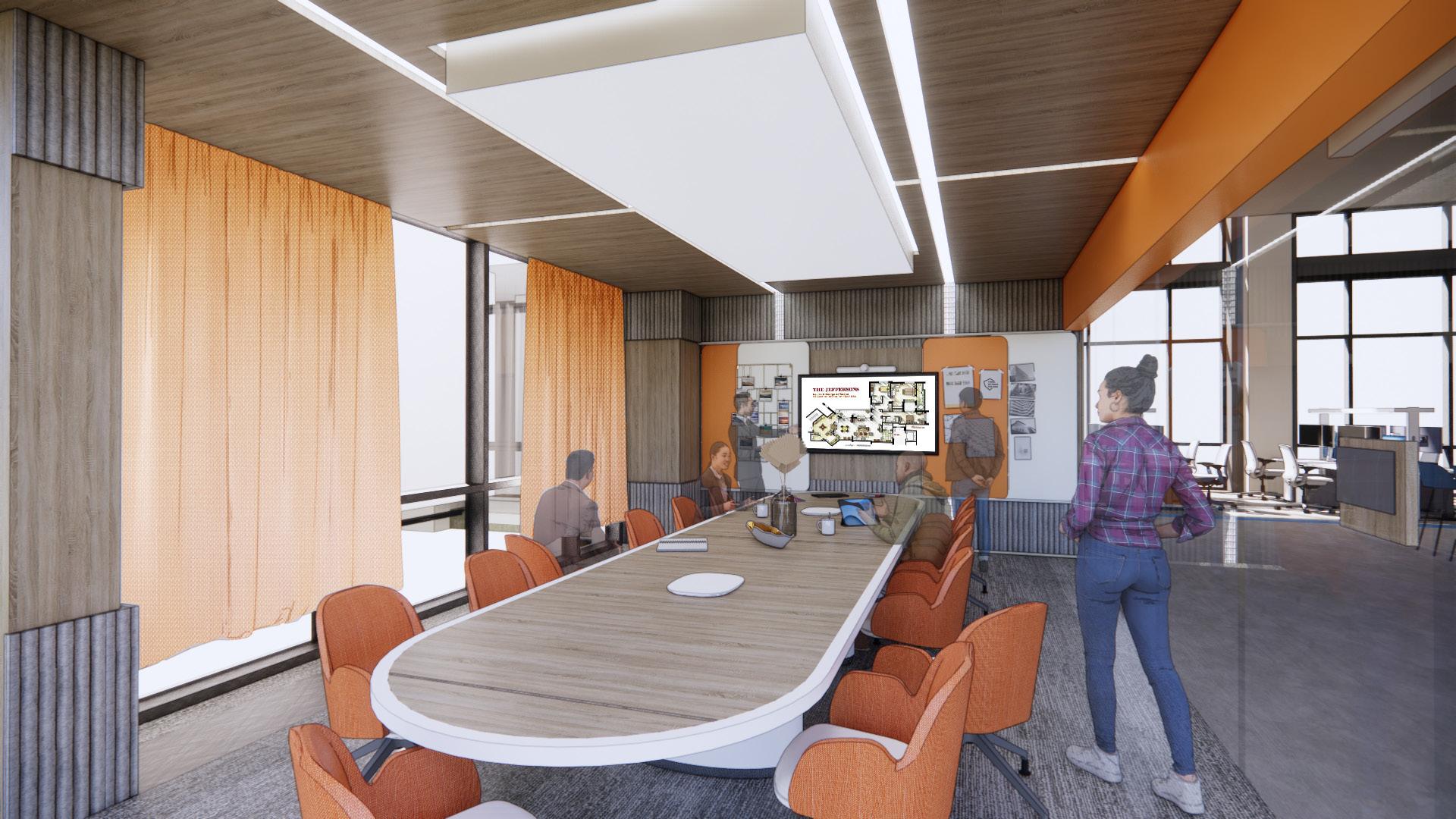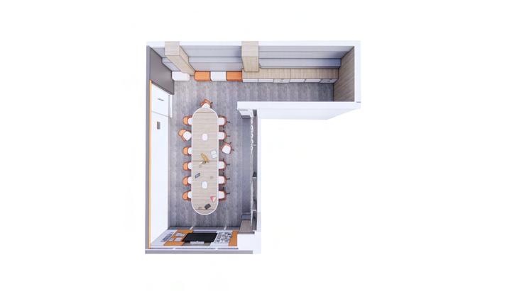 16 seats are available to allow for larger meetings. ttomans are offered in the back to allow for interns to join or sit back on the meetings.