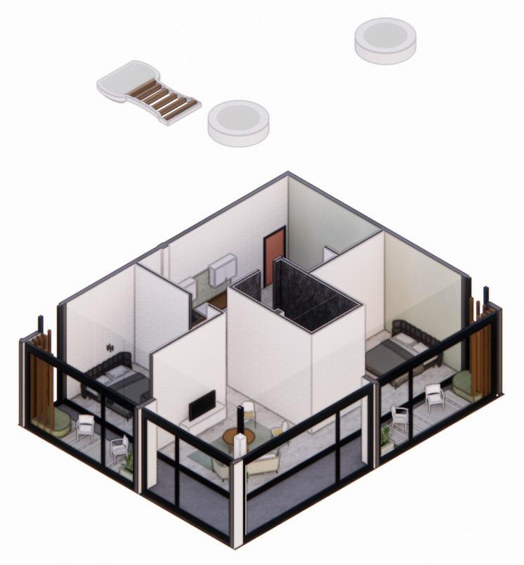 The double unit includes everything the single unit provides with much more. It includes two beds allowing the owners to have seperate beds depending on there sleeping arrangments or allow more spaces to sleep for guests and family. The double unit also includes a larger kitchen and a living room for the occupants to convers and watch tv. The space also includes two balcony seating arrangments located outside both bedrooms to offer a comfortable place and a good view