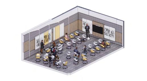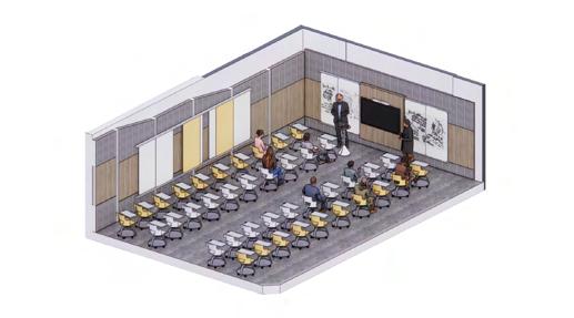 Easily movable furniture is applied to allow for multiple different layouts and to accomodate for the large capacity the room offers.