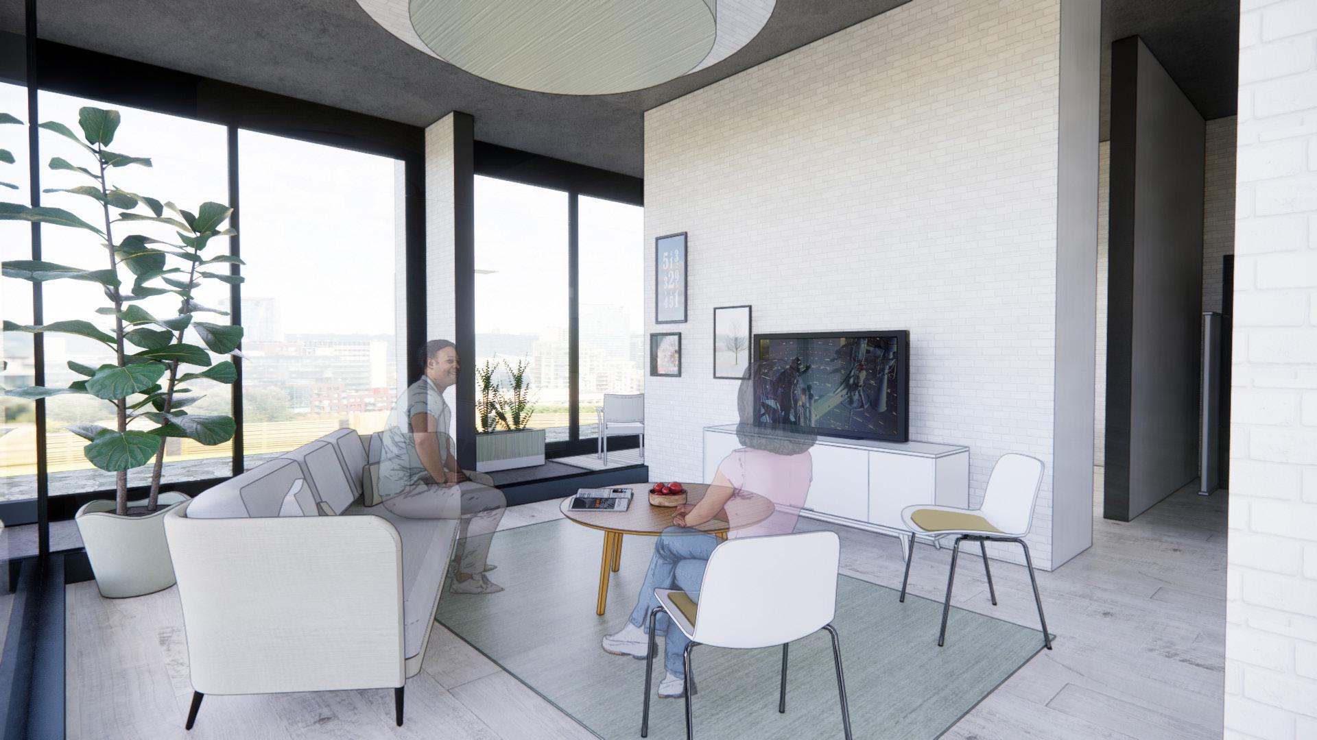 The single unit includes many seating options in the kitchen to allow for meals with guests. The space also includes a similar size bathroom to that of the double unit. Located adjacent to the bedroom is a balcony space that is inclosed to allow the occupant to enjoy a great view no matter the weather.