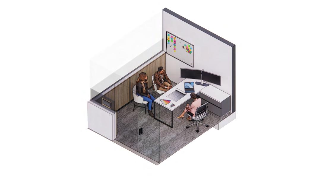 There are 9 private offices in total and 3 different layouts. All private office layouts allow for privacy while still being able to maintain a connecting visual betweent the office and workstations. This is done through the half wall tinted windows located in every office. Signage is applied on the exterior of every office to allow guests to identify which office number and who is located within each space. Every office is ADA accessible, providing optimal wheelchair accesibility for guests and workers alike.