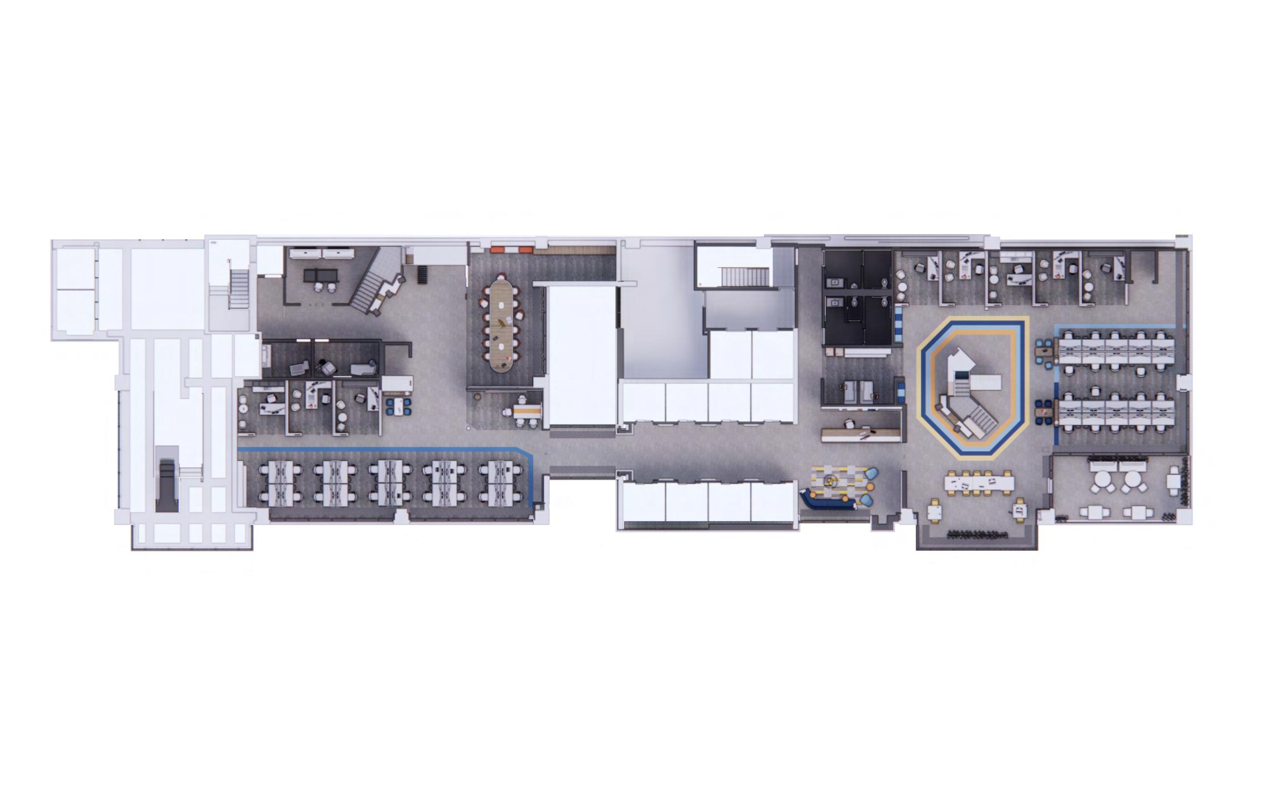My concept is a network based on the definition of “a group of systems of interconnected people or things.A network is visually seen as an intersection of lines but a network in a place of work can be the start of a community. Many people know about the train system that runs throughout the city of Dallas. The train system is a long network of lines moving together to bring people closer to other neighboring communities. When developing this floor plan, I took inspiration from the train system and created a wayfinding system that moves through space. The three colors, Yellow, Blue, and Orange are all inspired by the city’s train carts and their exterior design of colors. These elements of color will run throughout the space creating circulation and a wayfinding system for the new employees. The circular-on path is not only a circulation path but also during the dark lights up to illuminate spaces