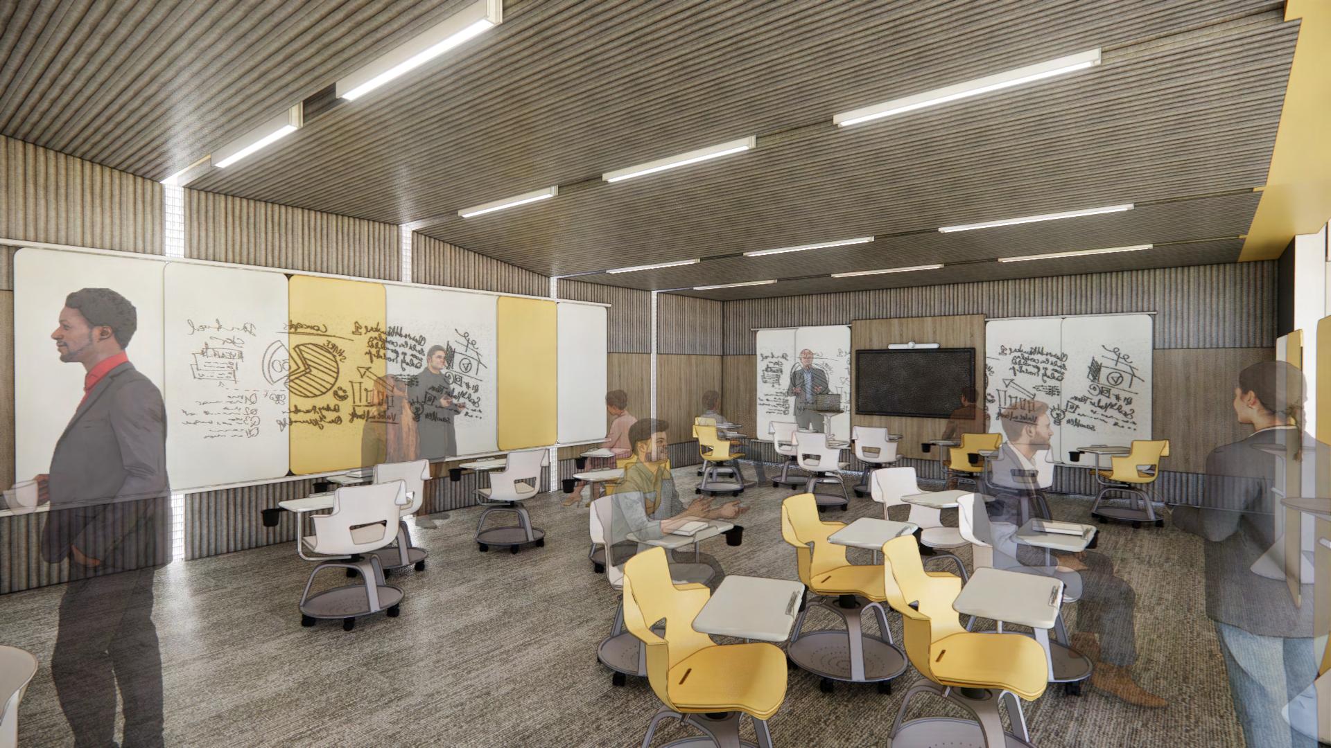 Markerboards are stationed on every wall to allow for multiple meetings to occur at the same time.