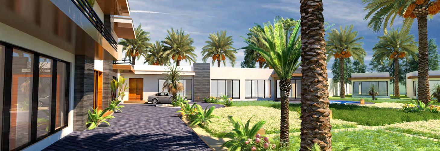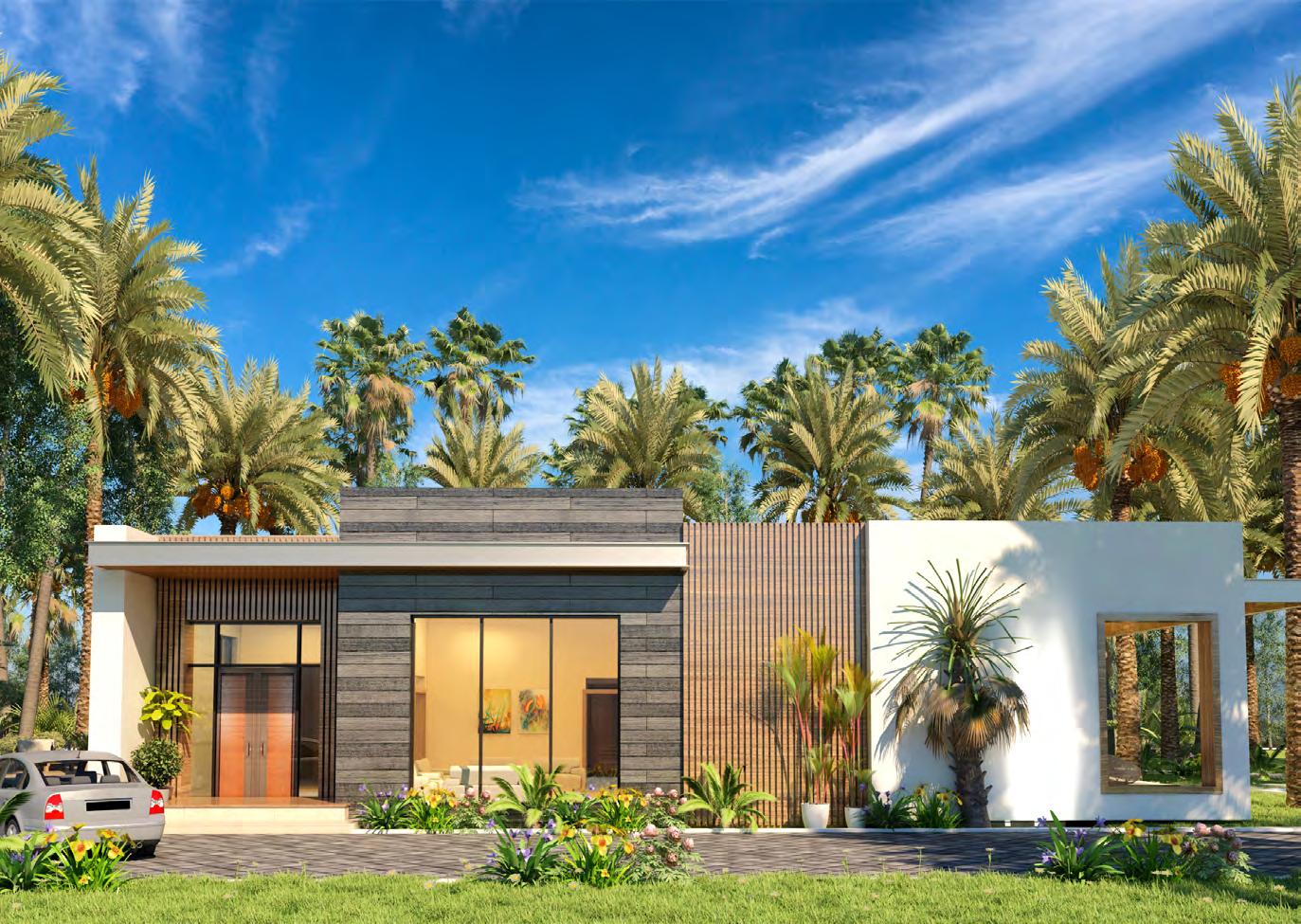 This box-shaped building sits right in the center of date’s farm. The arrangement of the spaces transforms the outdoor space into an integral part of the building. House features glazed facades on the South and East sides to open up to views of the surrounding Oasis in the desert.