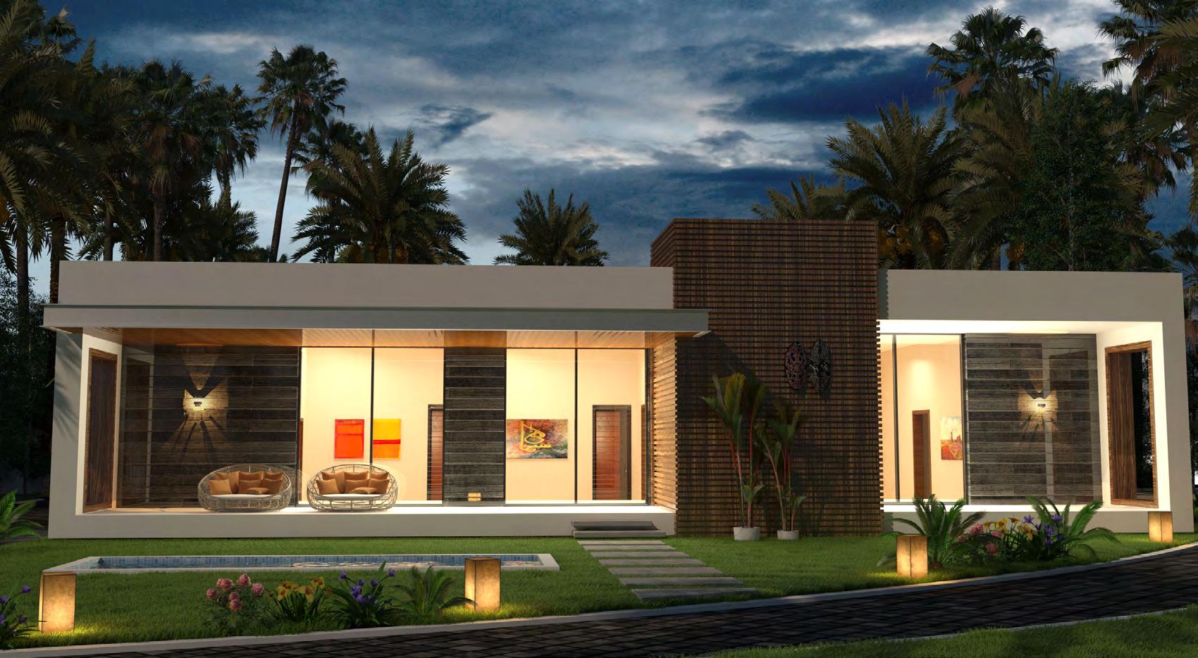 Full-height glazed surfaces allow natural light to flood into all area of the villa. Sliding windows can be retracted to open up the interior to backside pool area and frontside garden area.