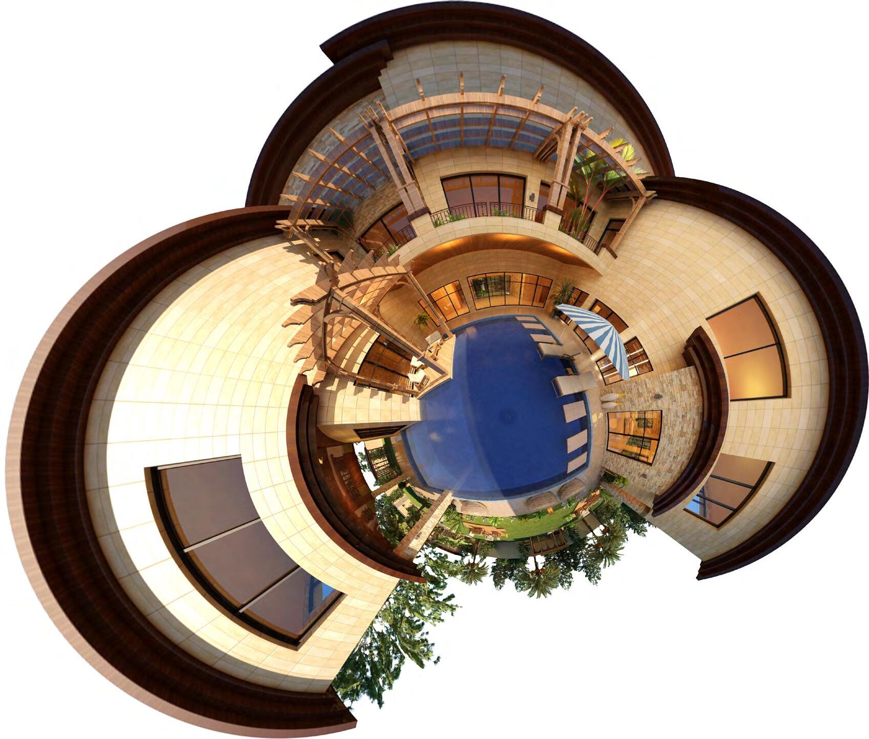The villa is C-shaped in plan, and the full height windows around the pool bring ample daylight in interior areas.