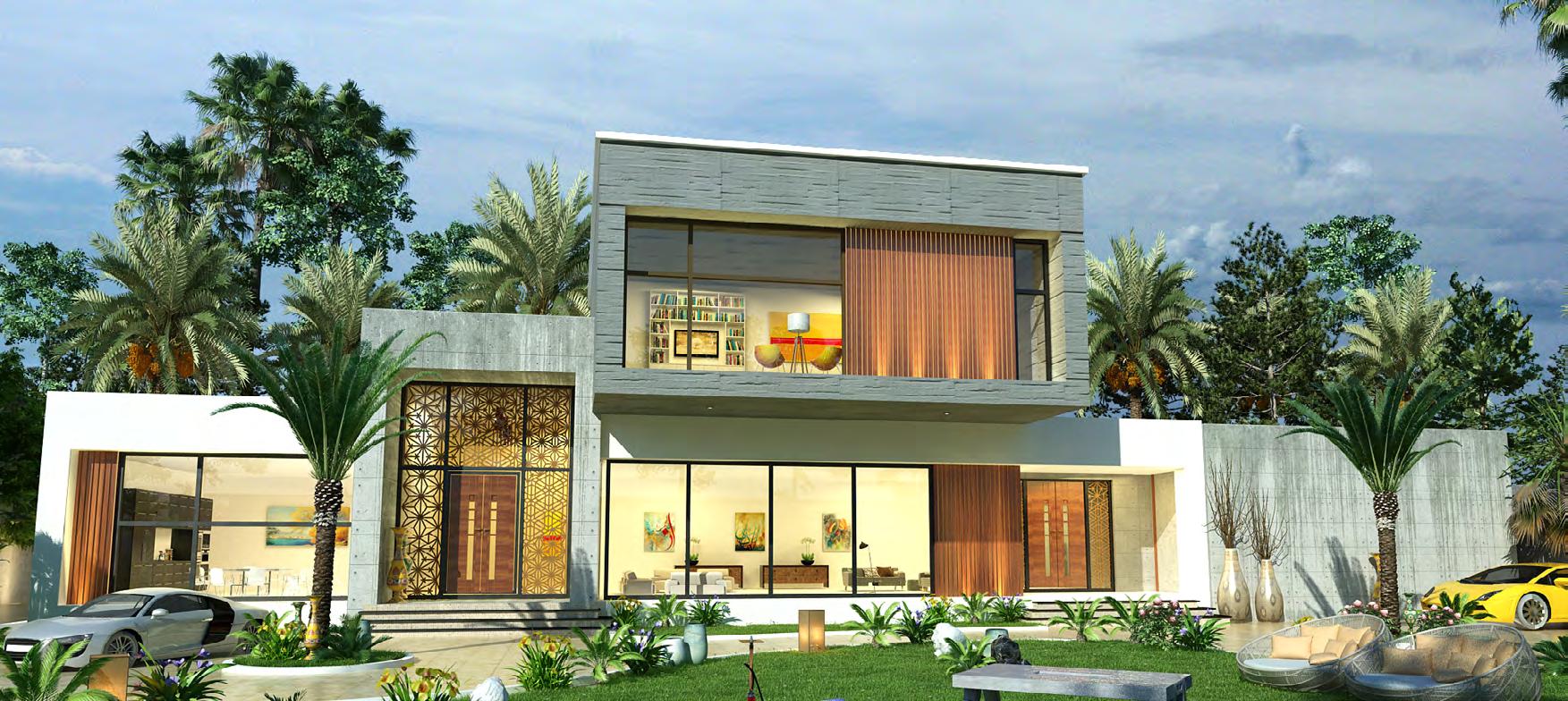 The elevation of this Small Villa is a mixture of modern and traditional local materials. The building consists of interlocked, rectilinear volumes clad in stone, wooden strips and Riyadh stone.