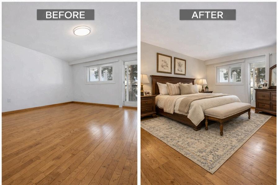 Primary bedroom offers space for a king bed plus extra storage (optional staging shown)