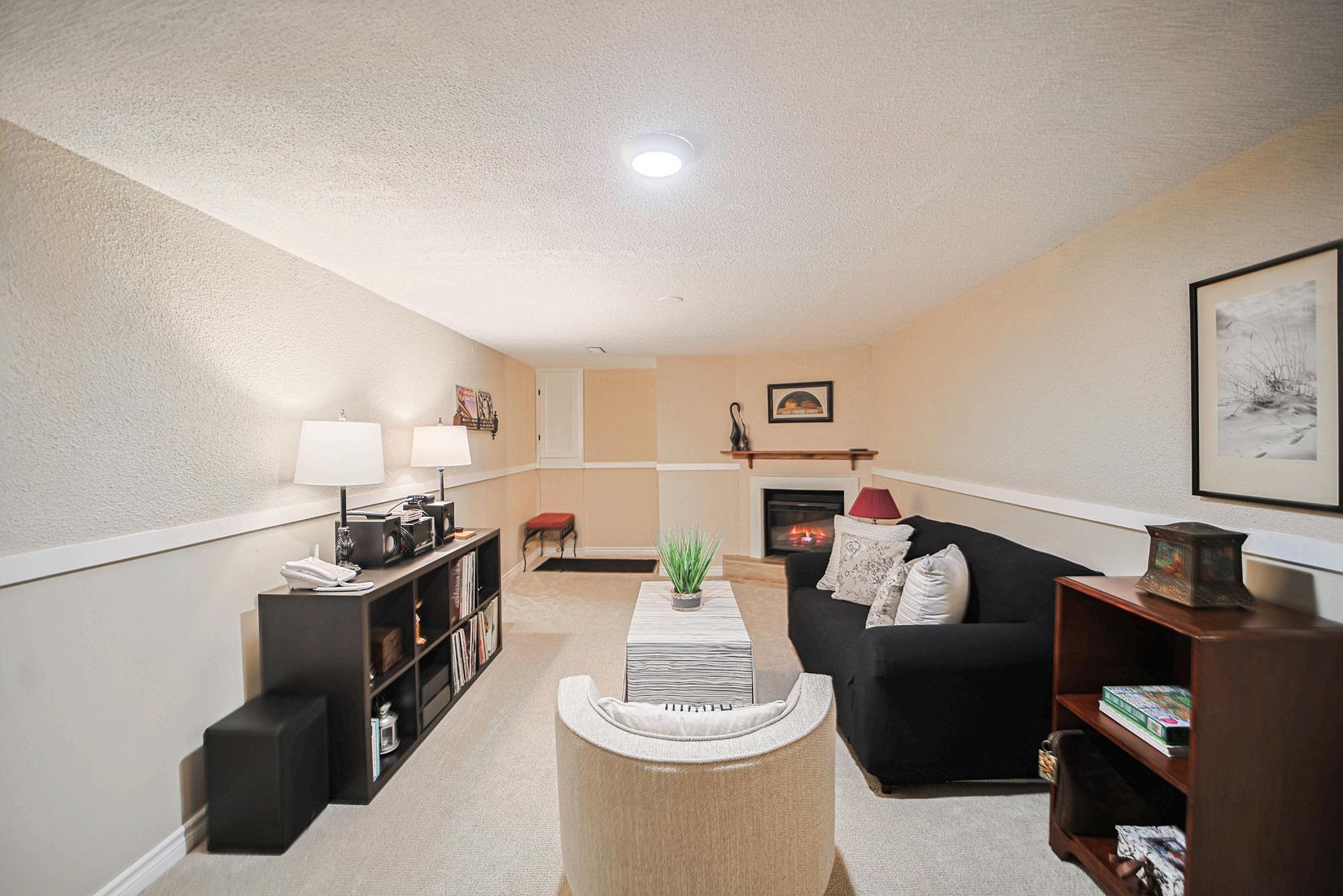 The finished lower level offers a spacious family room featuring a cozy electric fireplace, which is a rare feature within the complex, along with a separate office space, laundry area, and direct interior access to the underground parking garage. The unit includes two underground parking spaces, conveniently located directly in front of the garage access.