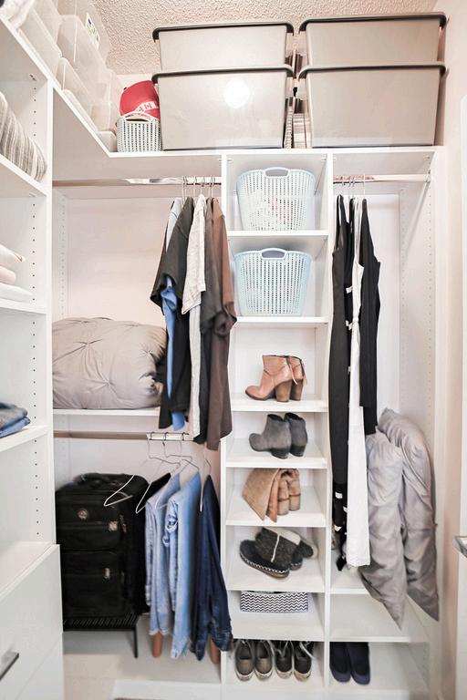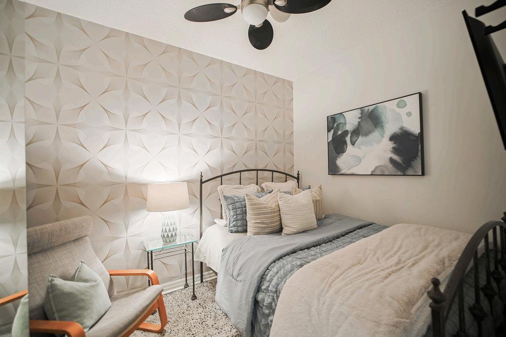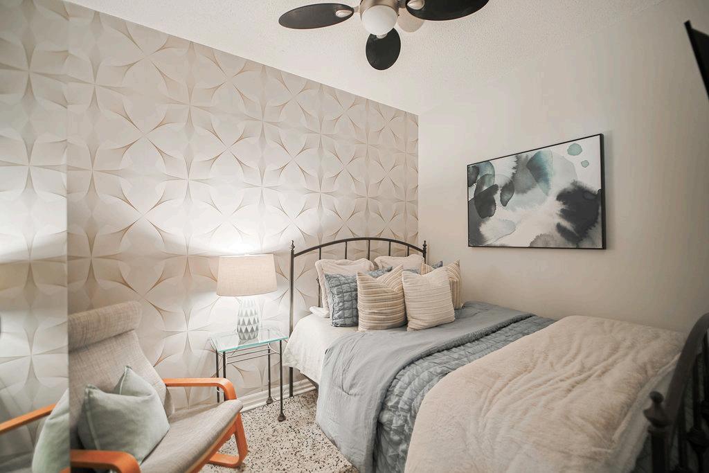 The thoughtfully designed kitchen features sleek grey countertops and plenty of prep space, opening seamlessly to a spacious living and dining area that’s ideal for entertaining or relaxing. The primary bedroom includes a walk-in closet with custom organizers, while the separate den offers flexibility for a home office, guest space, or reading nook.