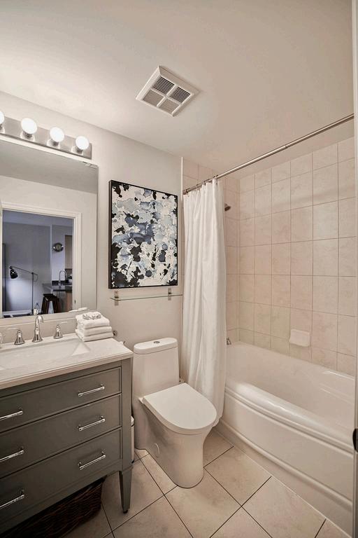 The gourmet kitchen offers quartz countertops and tile backsplash, elegant cabinetry, stainless steel appliances, and tile floor.