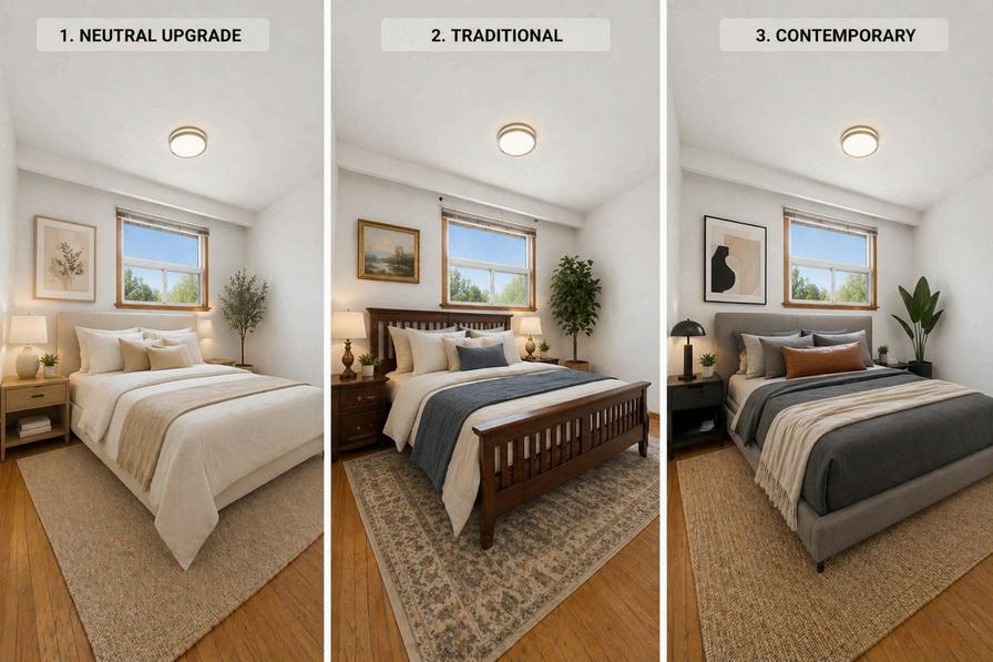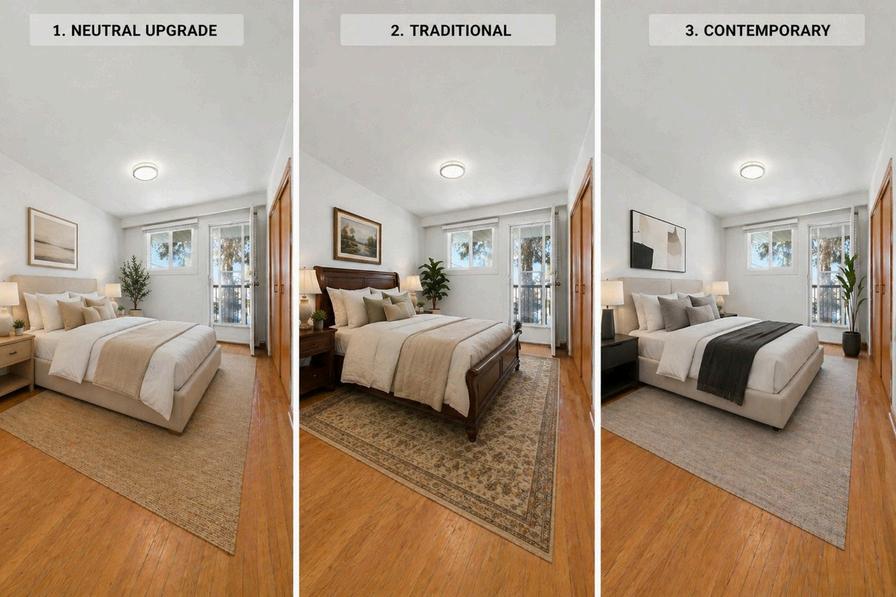 Just styling, colour, and texture three ways to reimagine this primary bedroom, all centred around comfort, calm, and that walkout balcony you didn’t know you needed to start and end your day right.