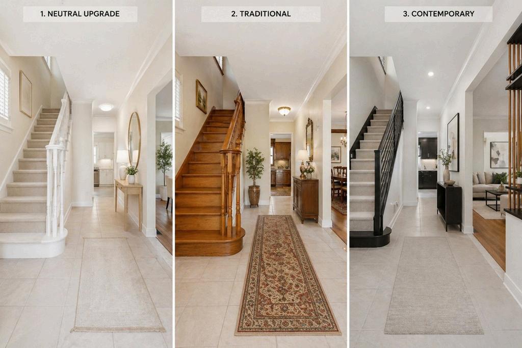 The main floor features a bright, airy layout filled with natural light and rich hardwood flooring throughout. A large, separate living room and dining room create an ideal balance of everyday comfort and elegant entertaining, offering excellent flow for both family life and formal gatherings. The main hallway draws you naturally through the home, ending at the spacious, open kitchen an inviting focal point with endless potential. A beautifully finished wooden staircase leads to the upper level, adding warmth and architectural character. Completing the main floor is a convenient 2-piece powder room located just off the front foyer, perfect for guests and daily living.
