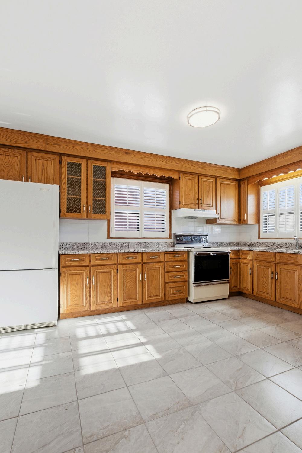 The kitchen is generously sized and filled with natural light from multiple windows. It offers a double stainless steel deep undermount sink and an abundance of cupboard space, making it highly functional as-is. While not currently configured as an eatin kitchen, the size and layout offer endless possibilities for a stunning, reimagined design.
