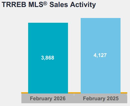 GTA REALTORS® reported 3,868 home sales through TRREB’s MLS® System in February 2026 –down by 6.3 per cent compared to February 2025. New listings entered into the MLS® System amounted to 10,705 – down by 17.7 per cent year-over-year.