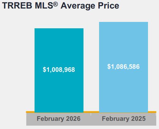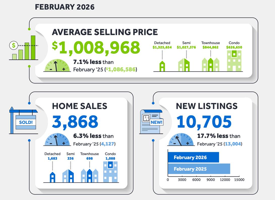 The MLS® Home Price Index (MLS® HPI) Composite benchmark was down by 7.9 per cent yearover-year in February 2026. The average selling price, at $1,008,968, was down by 7.1 per cent compared to February 2025.