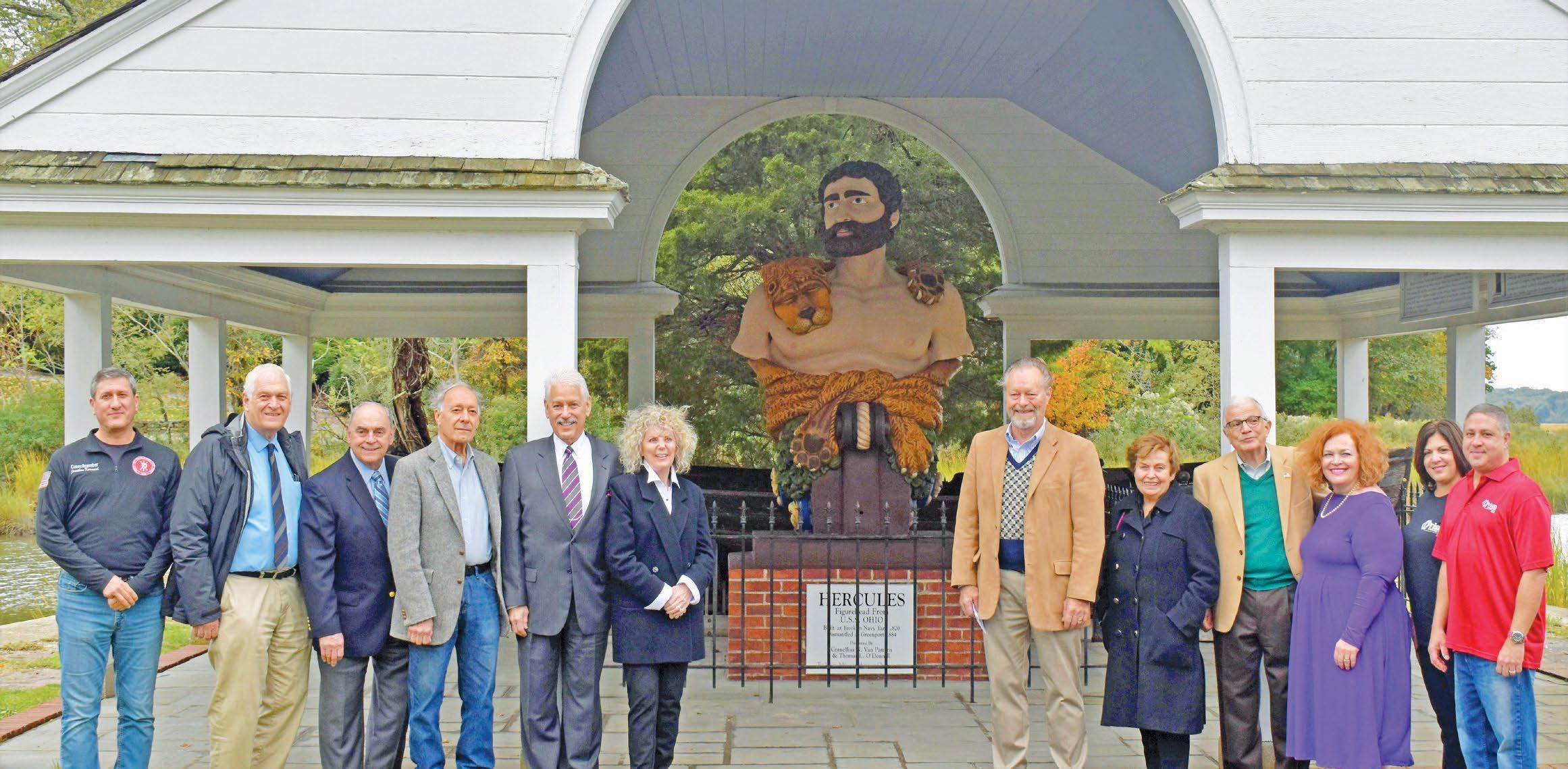 Elected officials, Ward Melville Heritage Organization board members and philanthropists Harlan and Olivia Fischer announced the restoration of Stony Brook’s Hercules. Photo above from WMHO; photo below by Rita J. Egan
