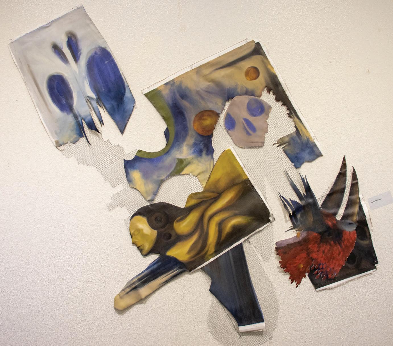 The name of the exhibition comes from the different mediums featured in the gallery, paper sculptures and paintings. Student work from Dana Ferrara’s Painting I and II classes and Jessica Grabowski’s design classes decorate the corridor.