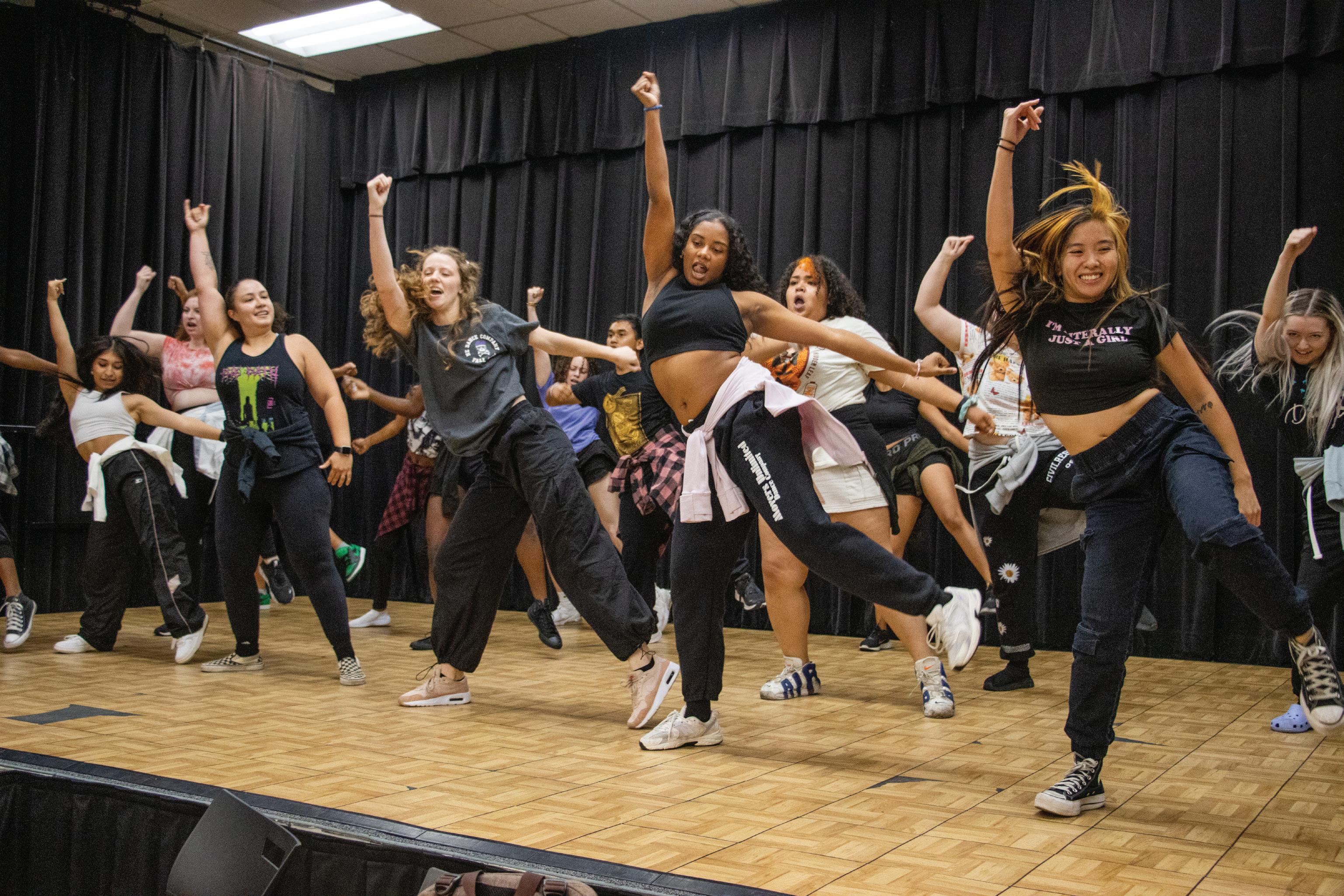 Members of NE’s Dance Club, Mover’s Unlimited Dance Company perform onstage to help promote the dance program on NE Campus.