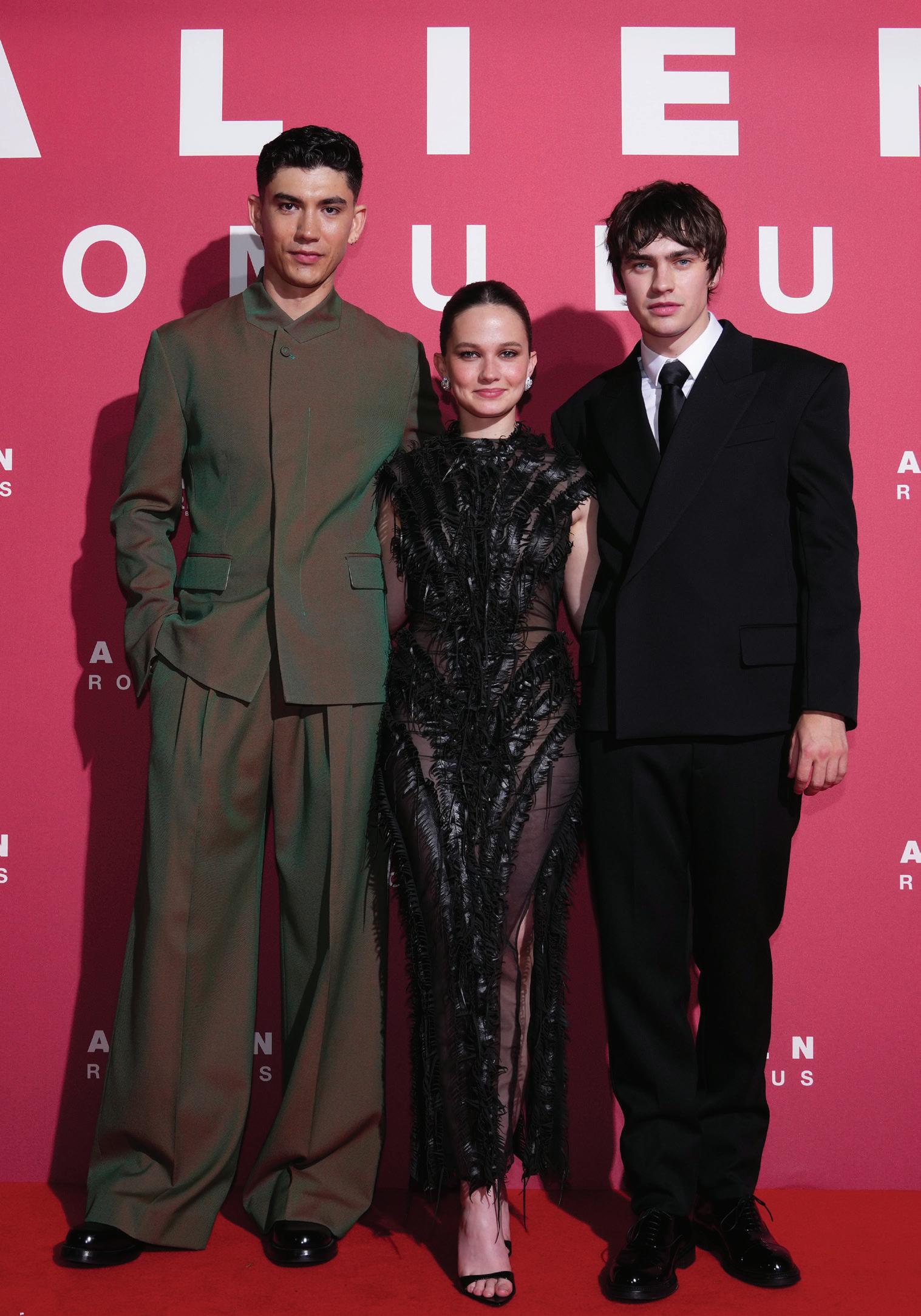 Cast members, from left, Aileen Wu, Isabela Merced and Archie Renaux arrive at the premiere of “Alien: Romulus”
