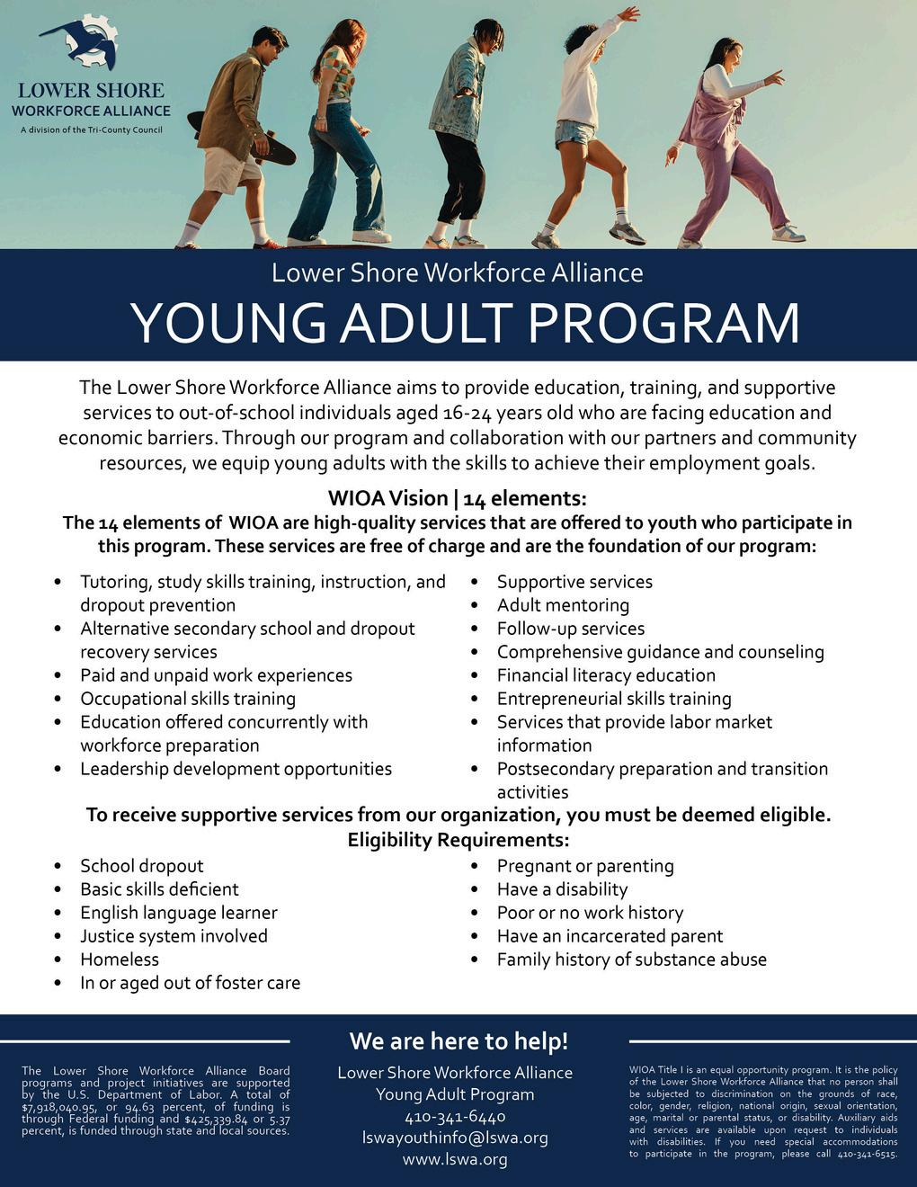 WIOA TITLE I IS AN EQUAL OPPORTUNITY PROGRAM. IT IS THE POLICY OF THE LOWER SHORE WORKFORCE ALLIANCE THAT NO PERSON SHALL BE SUBJECTED TO DISCRIMINATION ON THE GROUNDS OF RACE, COLOR, GENDER, RELIGION, NATIONAL ORIGIN, SEXUAL ORIENTATION, AGE, MARITAL OR PARENTAL STATUS, OR DISABILITY. AUXILIARY AIDS AND SERVICES ARE AVAILABLE UPON REQUEST TO INDIVIDUALS WITH DISABILITIES. IF YOU NEED SPECIAL ACCOMMODATIONS TO PARTICIPATE IN THE PROGRAM, PLEASE CALL 410-341-6515.