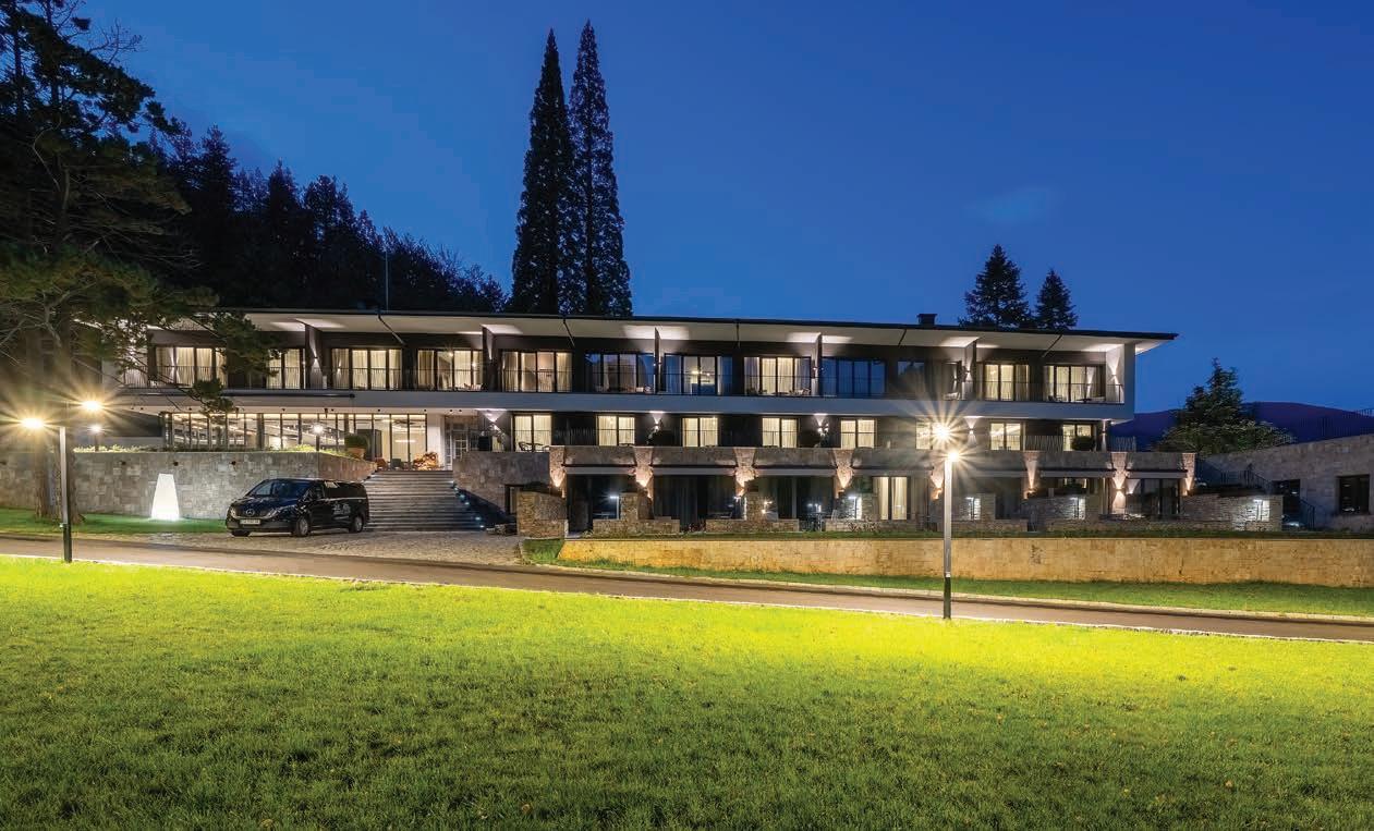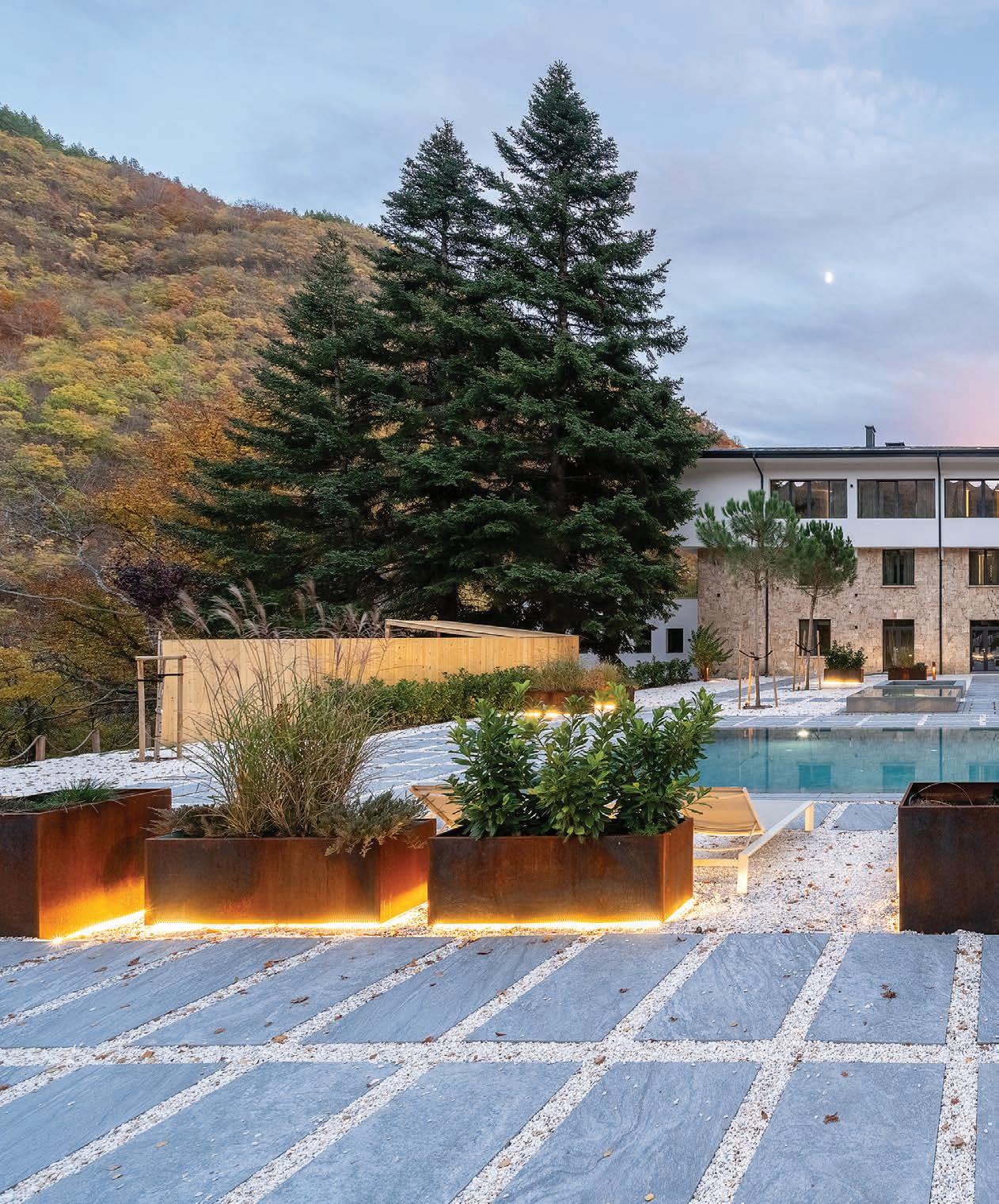 ефективно външно осветление и природни материали, които подчертават хармонията