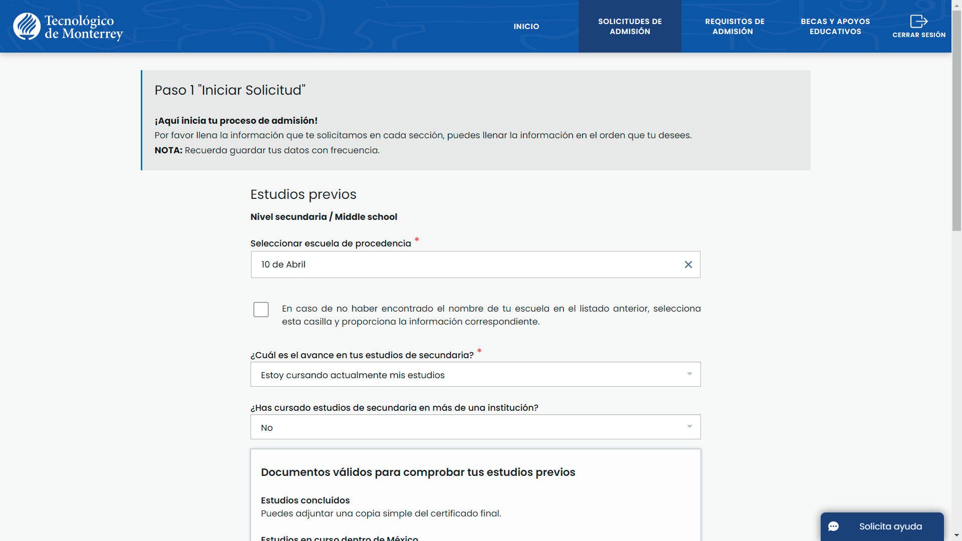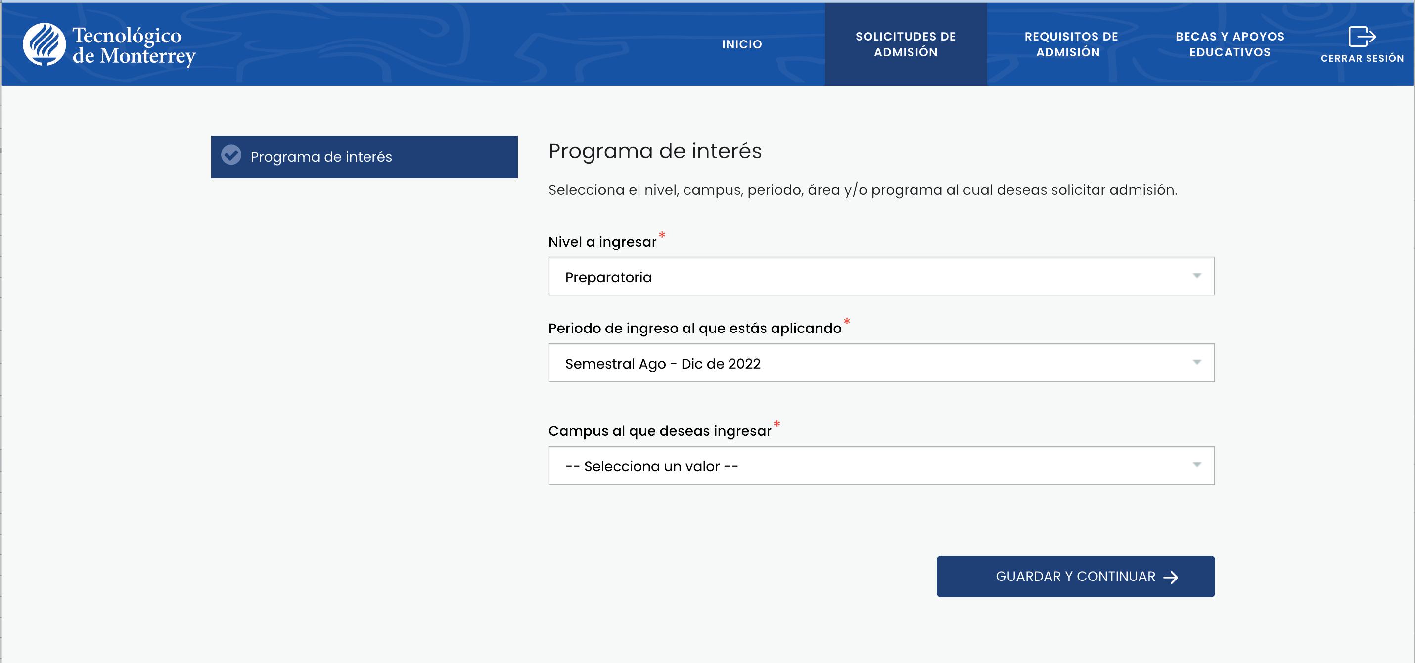 Lo primero que te solicitará es el nivel al que deseas admisión. Conforme vayas seleccionando se te abrirán las siguientes preguntas.