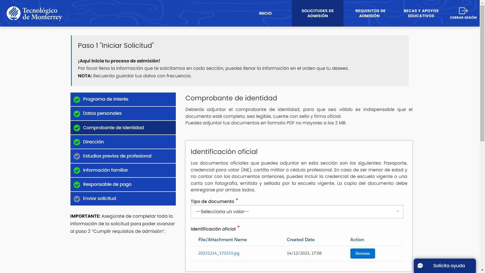 En pantalla verás los tipos de documentos y archivos aceptados para cubrir este requisito, deberás seleccionar el tipo de documento que vas a adjuntar.