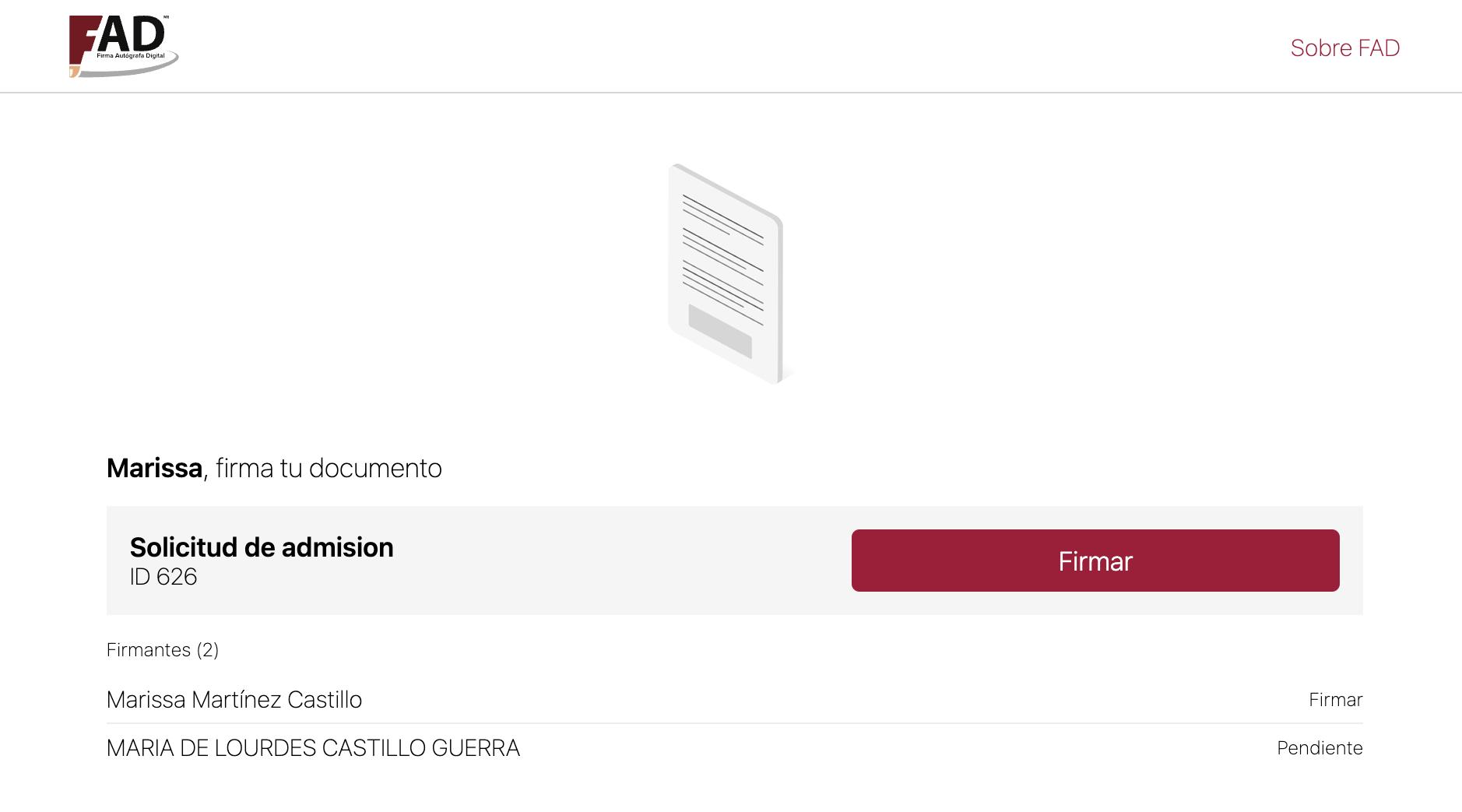 A continuación aparecerá el documento del proceso de admisión. Una vez que ha sido leído, dar clic en Firmar documento.