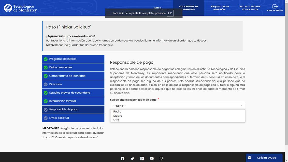 Deberás proporcionar información de quien será responsable de pagar tu colegiatura.