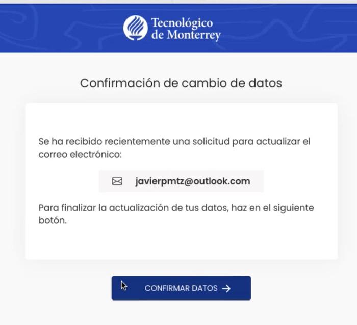 En el caso de solicitar una actualización de correo electrónico, deberá llegar un correo para confirmar el cambio. Da clic en el botón Confirmar Cambio.
