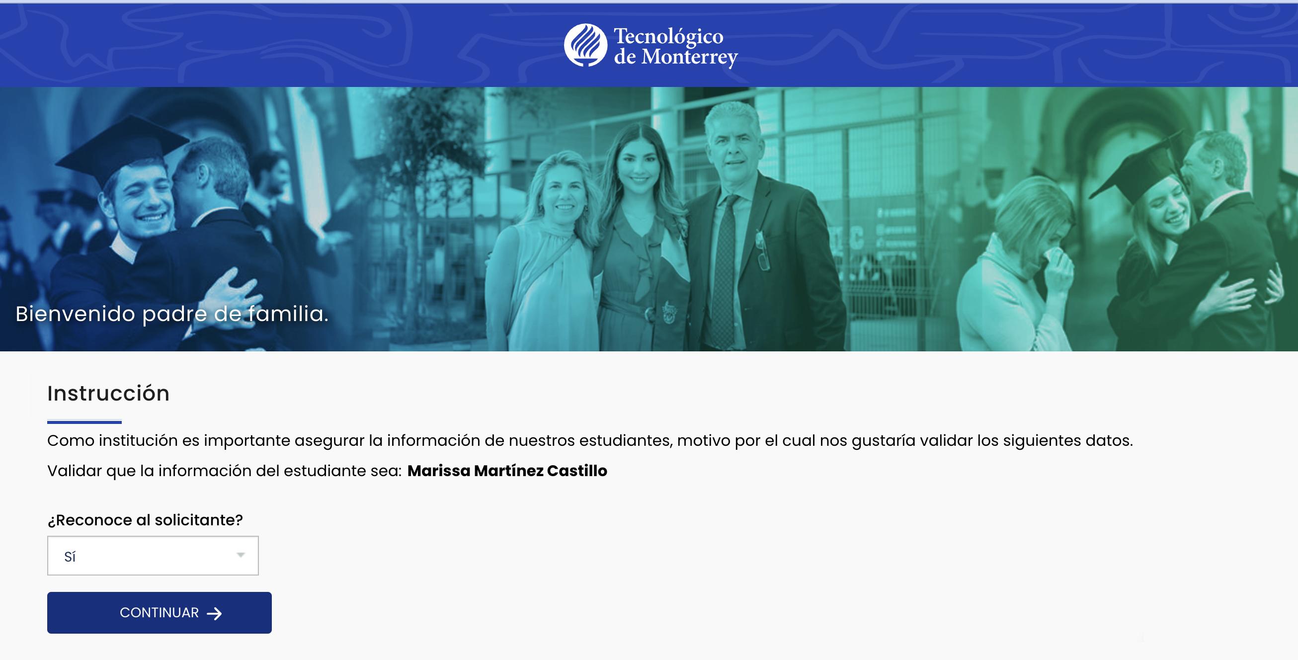 Cuando el familiar que te acompaña en tu proceso de admisión reciba el correo, lo llevará a esta página donde deberá confirmar la información que proporcionaste.