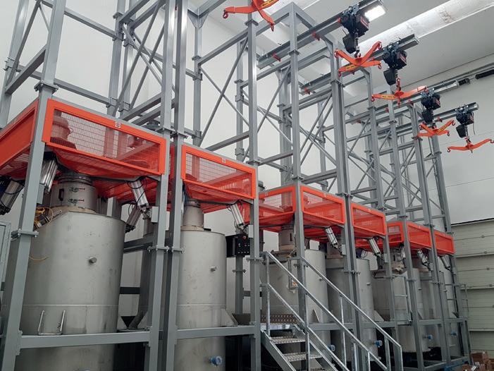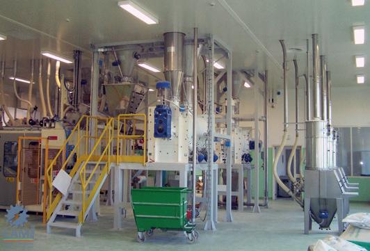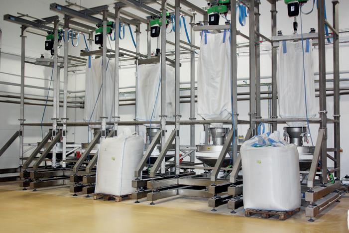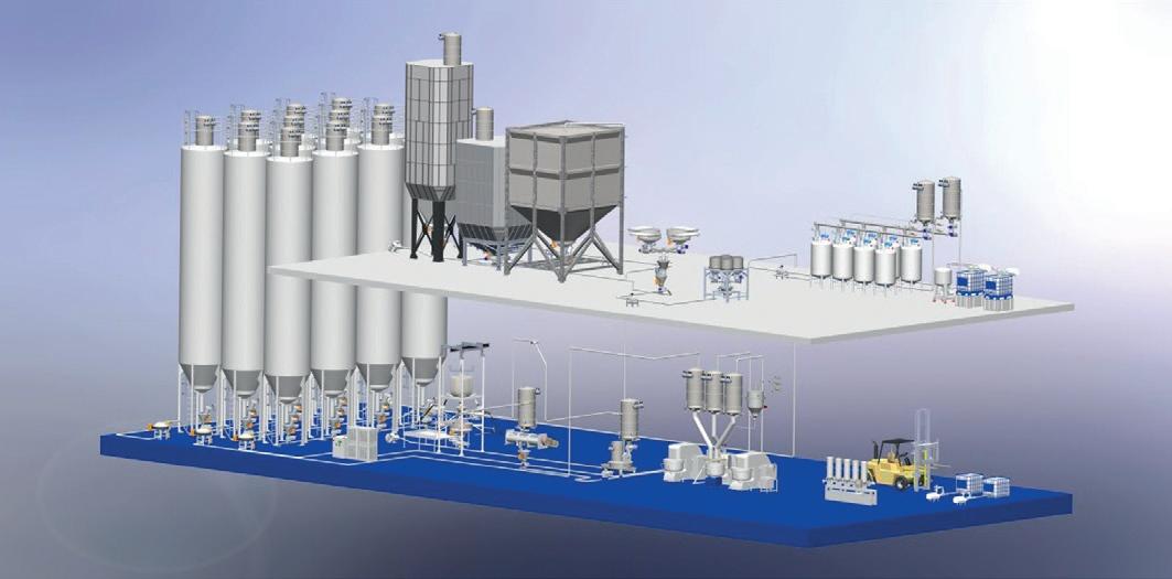 or outdoor silos, that can be loaded through bag or big-bag unloading systems, or directly from the supplier’s truck. Subsequently, raw materials are conveyed to the dosing point, through appropriate mechanical or pneumatic transport systems. Finally, the powder and/or liquid ingredients are dosed and mixed in the hoppers placed above the mixers. For micro-ingredients B&B Silo Systems has, instead, designed microdosers with manual or automatic loading.