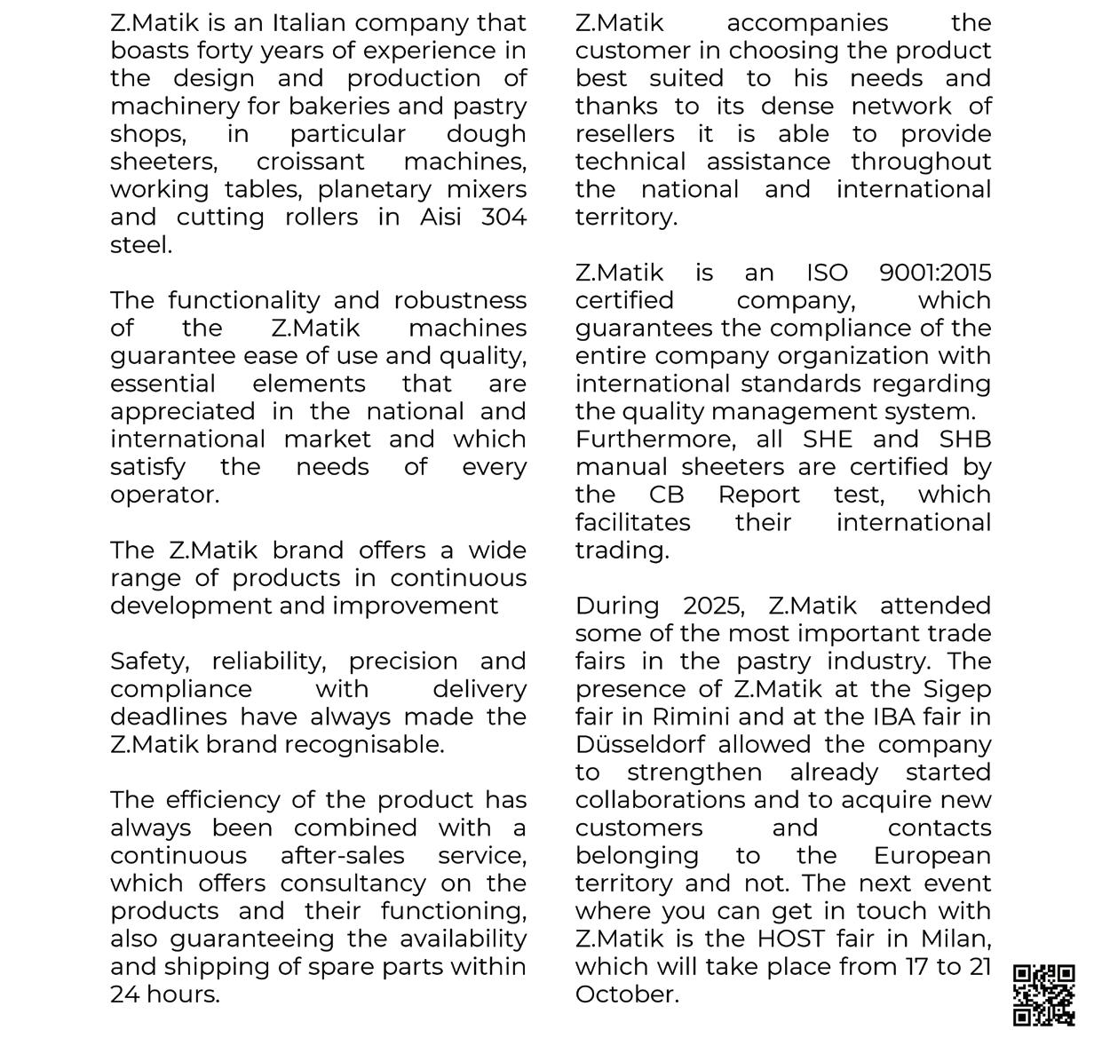 Since joining the ProMach Group in 2024—a global leader with over 50 brands—ZACMI has further strengthened its international presence. Driven by innovation and precision engineering, the company develops tailormade solutions that combine performance, reliability, and hygienic design. Its specialized R&D department and highly skilled technicians ensure continuous technological advancement and first-class customer support worldwide Machinery and solutions