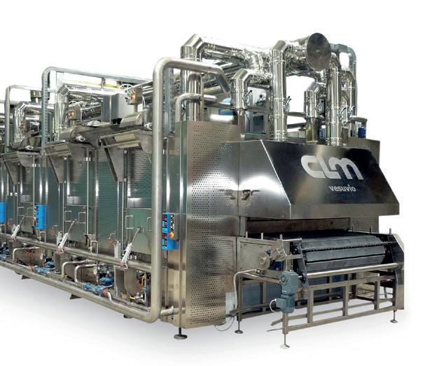 In CLM Bakery Systems wood-fired pizza lines the tunnel stone ovens marketed under the CLM Vesuvio brand, powered by gas and/or wood are equipped with the innovative patented embracing heat baking system and are accompanied by complementary equipment, such as the innovative automatic fermentation room for 24/48 hours sponge/biga fermentation and main dough fermentation in small bins of 25 kilos, the automatic dough balls proofer, crossing lamination and a special hot pressing technology which does not need any additional oil or flour.