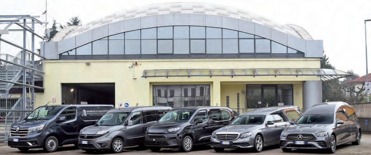 A fianco, il modello Acheronte, l’ultimo arrivato all’impresa Rhodense Funeral Service, qui sopra accanto agli altri mezzi realizzati da Bell’s Car.