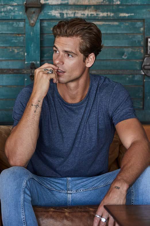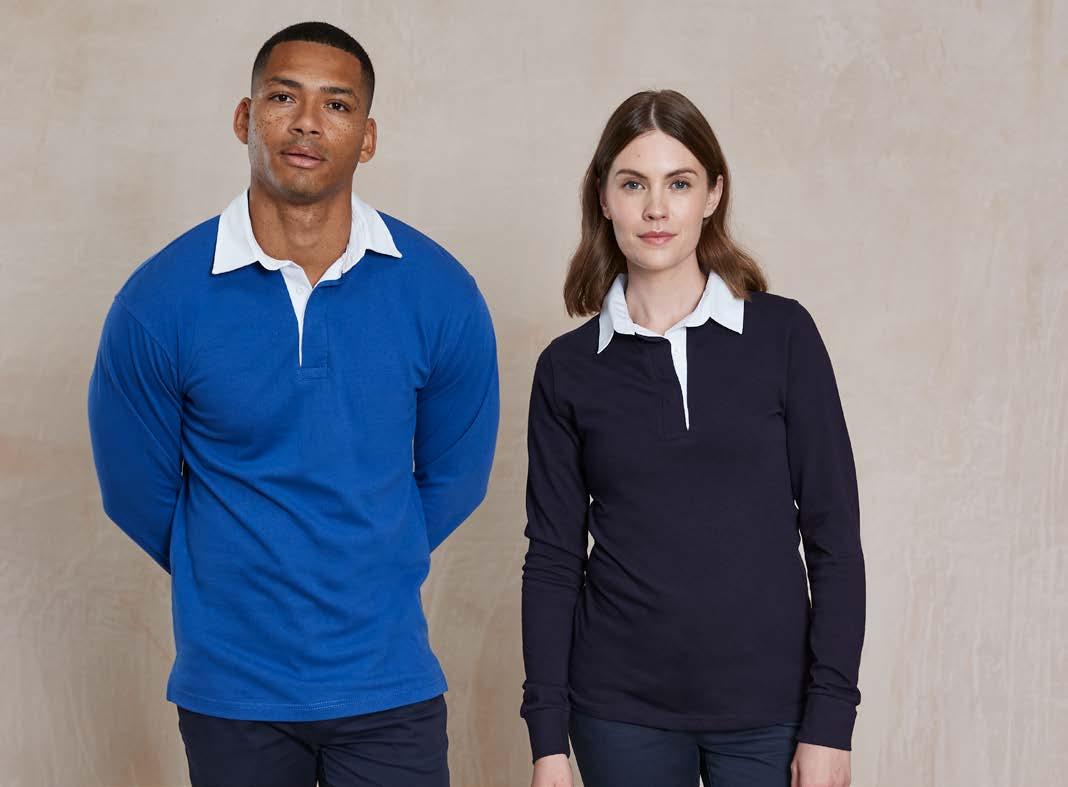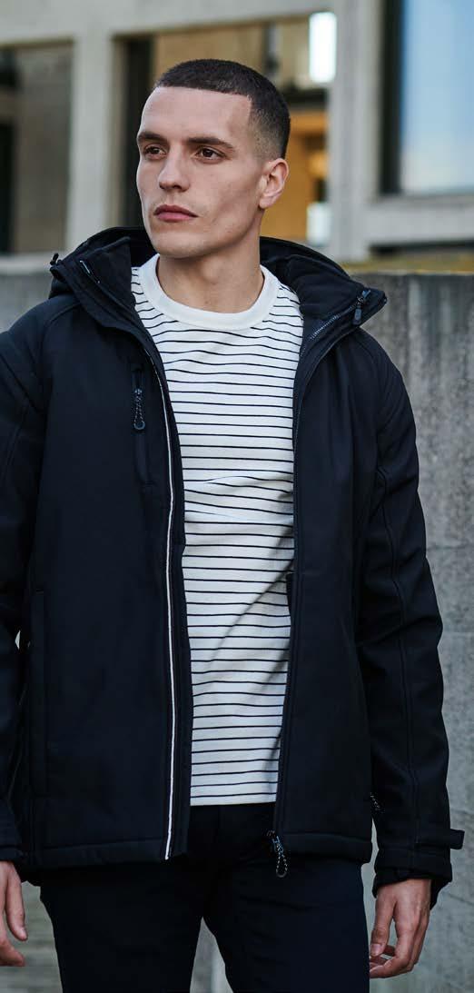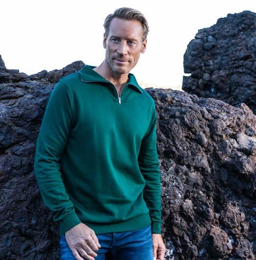 Coupe classique et tubulaire. Renfort d’épaule à épaule. Col tricoté à côtes 1x1 à surpiqûres. Manches travaillées pour un look plus actuel.
