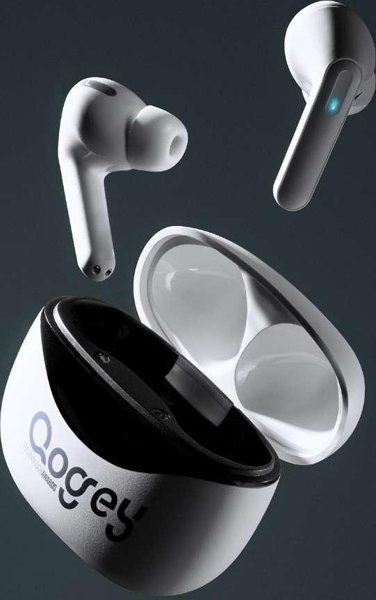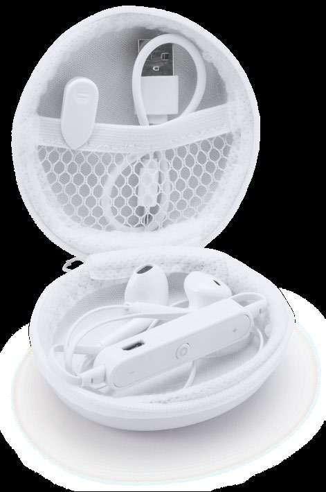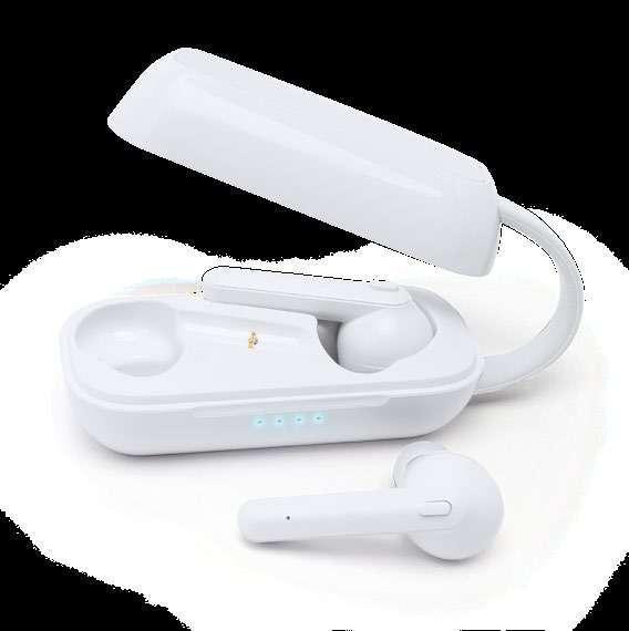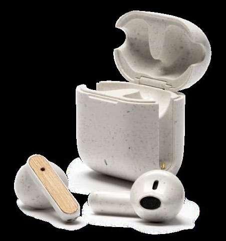 Écouteurs sans fil en ABS recyclé et liège naturel. Boîtier de chargement avec batterie rechargeable. Panneau de commande tactile intégré à l'écouteur. Fonction mains libres. Connexion de type C. Câble fourni. Présentation en boîte écodesign.