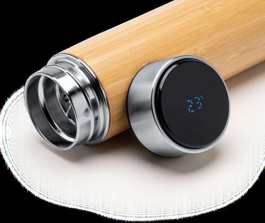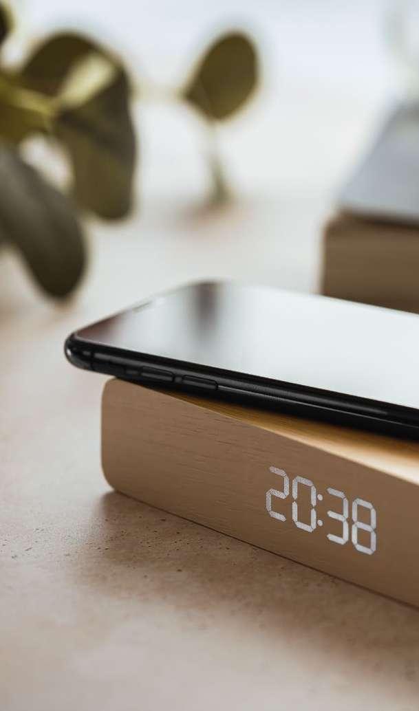 Horloge de table avec chargeur sans fil 5 W en bambou. Caractéristiques : heure, date, alarme et température. Connexion de type C. Câble fourni. Présentation en boîte écodesign.