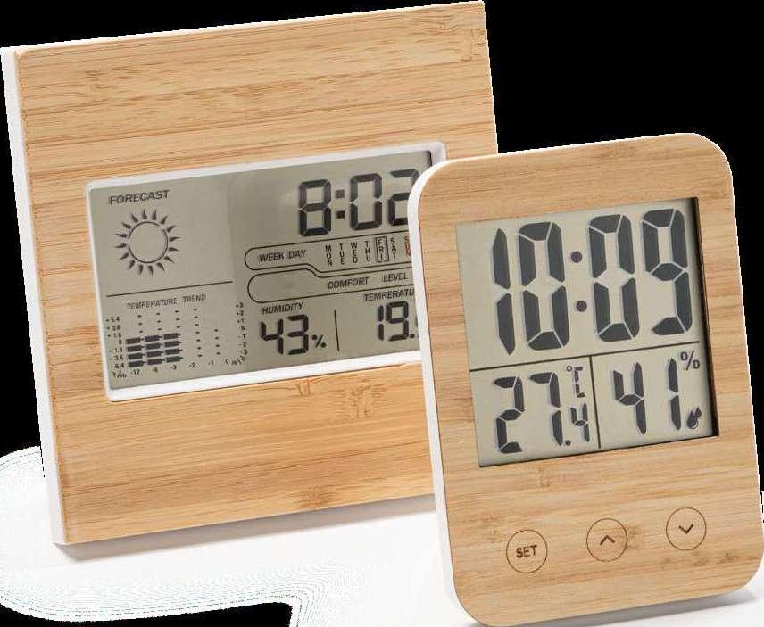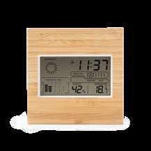 Station météo avec coque avant en bambou. Fonction horloge, calendrier et alarme avec capteurs de température et d'humidité. Il fonctionne avec 2 piles AAA non fournies. Présentation en coffret éco design.