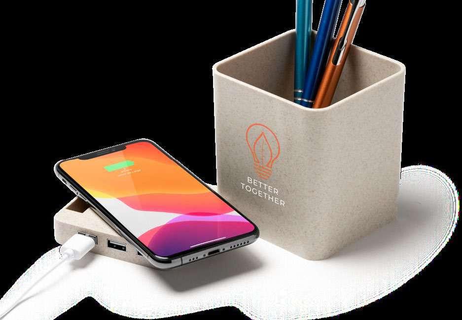 Porte-cayons avec chargeur sans fil intégré. Fabriqué en liège naturel. Comprend 2 ports USB supplémentaires à l'arrière. 5W. Câble inclus. Présentation en coffret éco design.