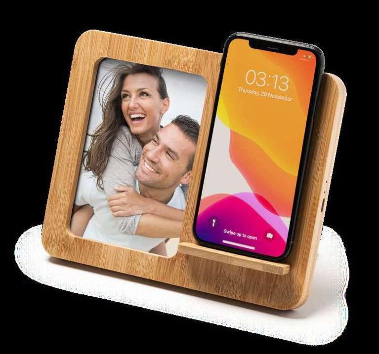 Chargeur sans fil avec cadre photo en bambou. Idéal pour les photos de 10 x 15 cm. Compatible avec les appareils technologiques sans fil. 10 W. Câble inclus. Présentation en boîte écodesign.