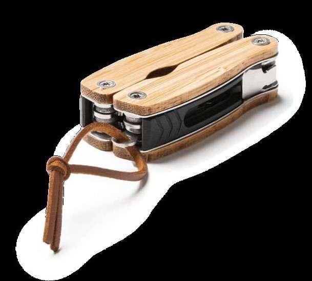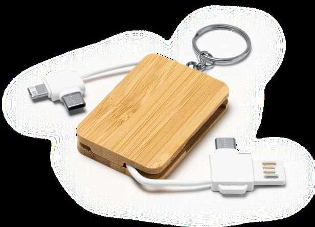 Porte-clés avec câble de charge 3 en 1. Structure principale en bambou naturel. Connexion Micro USB, Type C et Lightning. Présentation en éco sac avec ouverture.