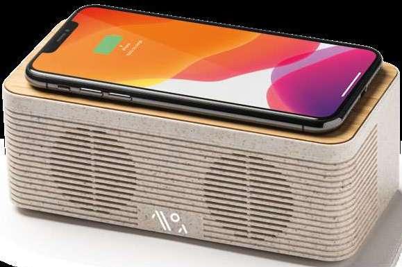 Haut-parleur Bluetooth sans fil avec corps en ABS, façade en bambou naturel et membrane visible. Comprend une poignée de transport en similicuir. Puissance 3W. Batterie rechargeable. Câble inclus. Présentation en coffret éco design.