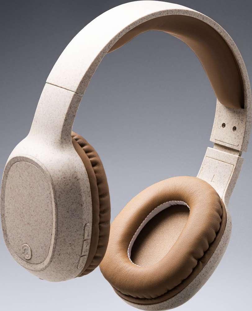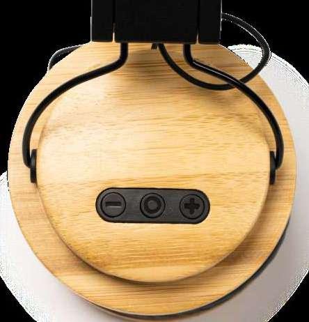 Écouteurs sans fil réglables en bambou et tissu RPET. Bandeau et oreillettes rembourrés. Contrôle tactile intégré avec technologie stéréo. Fonction mains libres. Batterie rechargeable. Câble de type C inclus. Présentation en boîte écodesign.