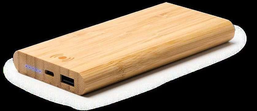 Bloc d'alimentation de 6 000 mAh avec fonction de charge sans fil. Structure principale en bambou naturel. Sortie DC5V/2.1A. Sans fil DC5V. Câble de type C fourni. Présentation en boîte éco-conception.
