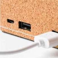 Haut-parleur avec corps en liège naturel et membrane visible. Bluetooth 5.0. Puissance 3W. Batterie rechargeable. Câble inclus. Présentation en coffret éco design.