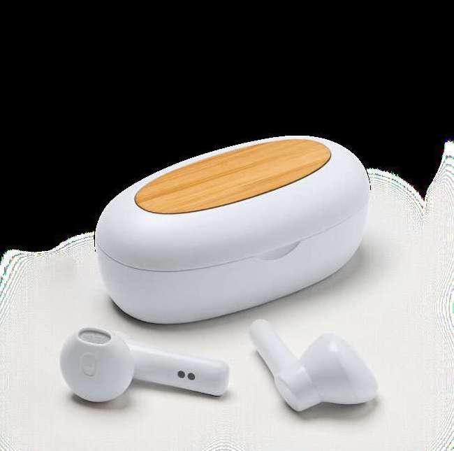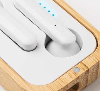 Casque sans fil Bluetooth 5.0 avec étui de chargement en bambou naturel. Bouton multifonction intégré dans les deux écouteurs. Fonction mains libres. Batterie rechargeable. Câble inclus. Présentation en coffret éco design.