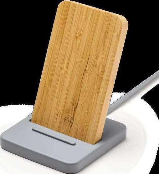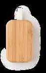 Chargeur sans fil avec corps en ABS blanc et surface supérieure en bambou naturel. Placez votre smartphone dessus et laissez-le se recharger. Compatible avec les modèles dotés de la technologie sans fil. DC5V. Câble inclus. Présentation en coffret éco design.